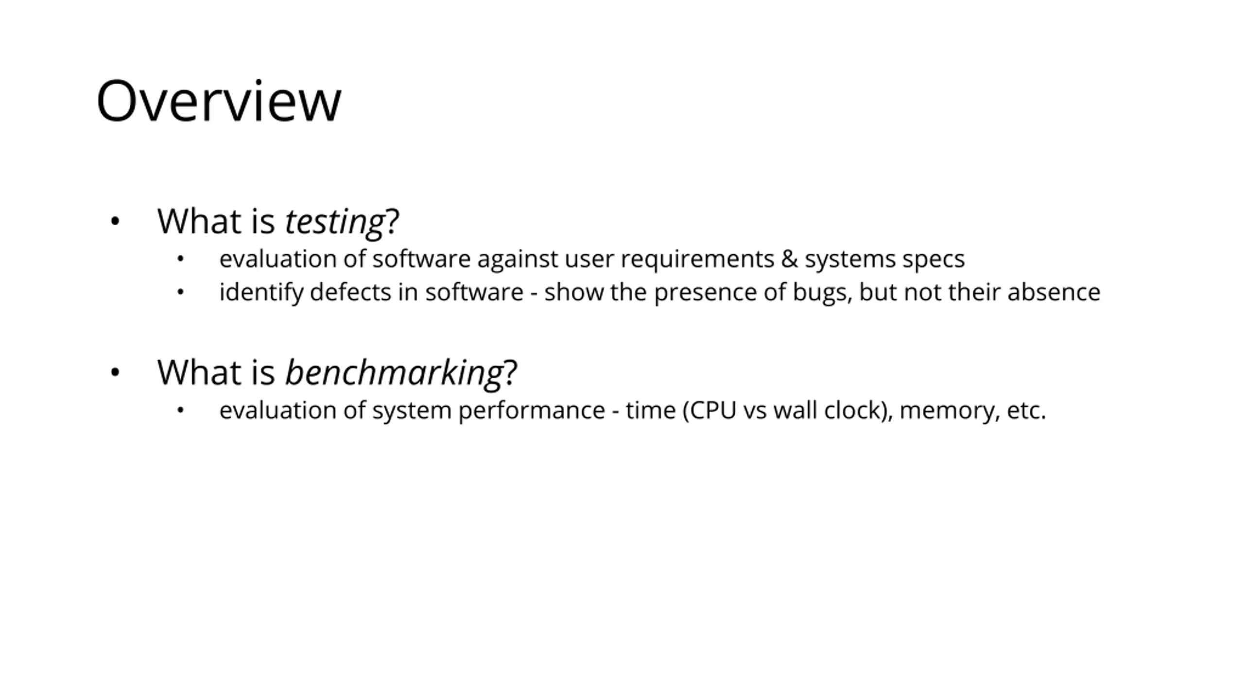 Overview What is testing? evaluation of software against user requirements & systems specs identify defects in software - show the presence of bugs, but not their absence What is benchmarking? evaluation of system performance - time (CPU vs wall clock), memory, etc.