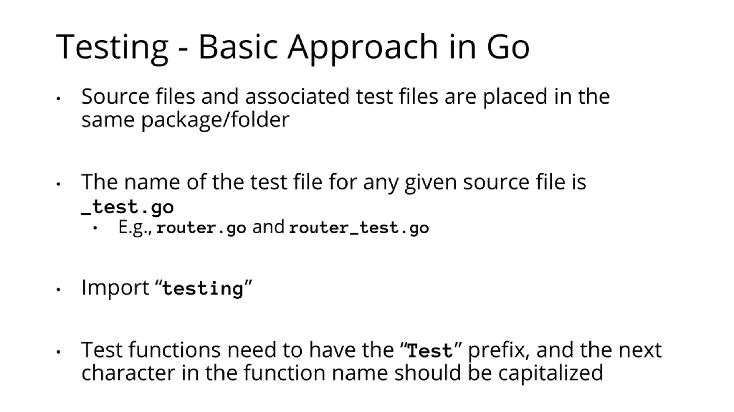 Testing - Basic Approach in Go Source files and associated test files are placed in the same package/folder The name of the test file for any given source file is _test.go E.g., router.go and router_test.go Import testing Test functions need to have the Test prefix, and the next character in the function name should be capitalized