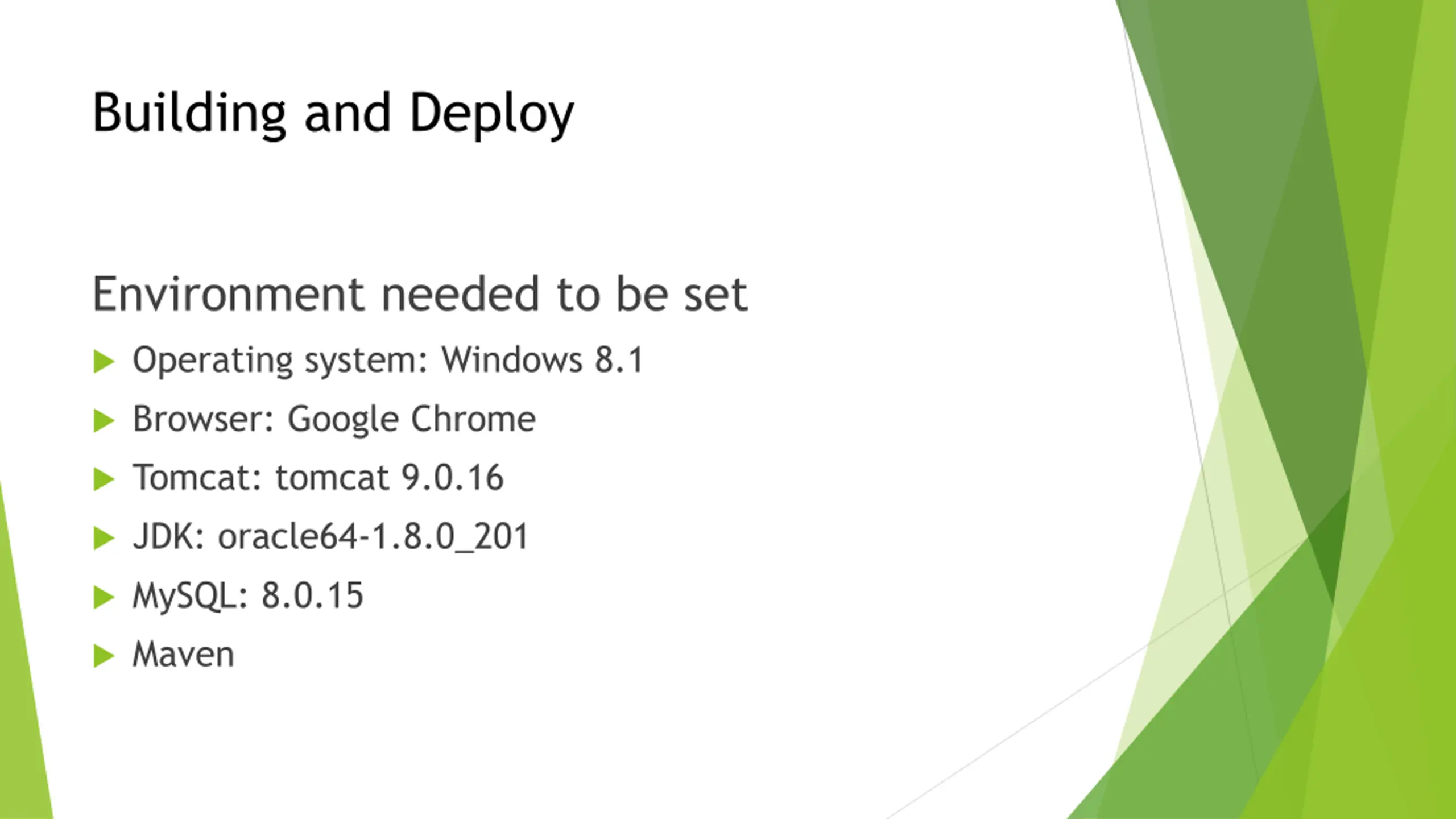 Building and Deploy Environment needed to be set Operating system: Windows 8.1 Browser: Google Chrome Tomcat: tomcat 9.0.16 JDK: oracle64-1.8.0_201 MySQL: 8.0.15 Maven
