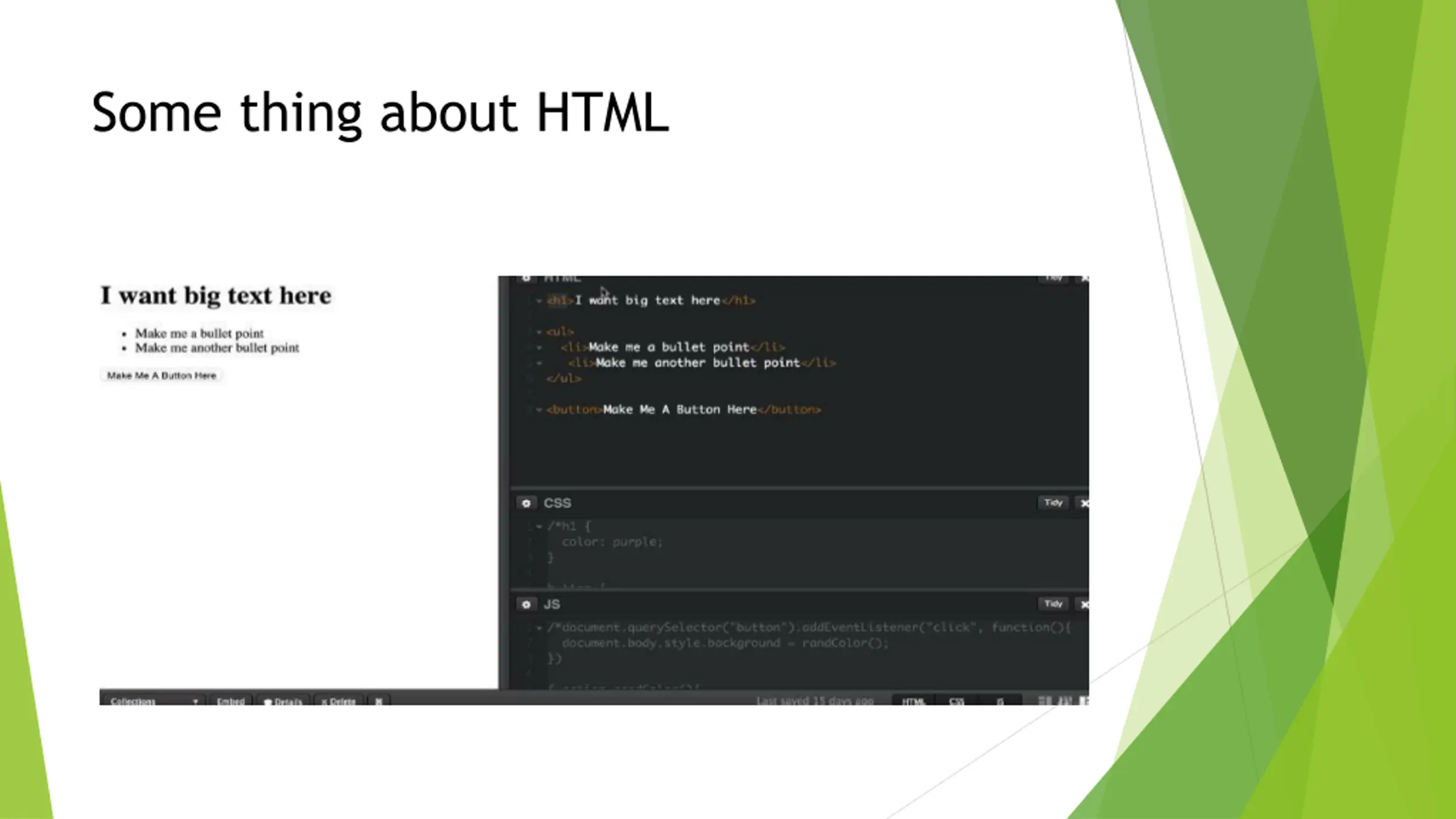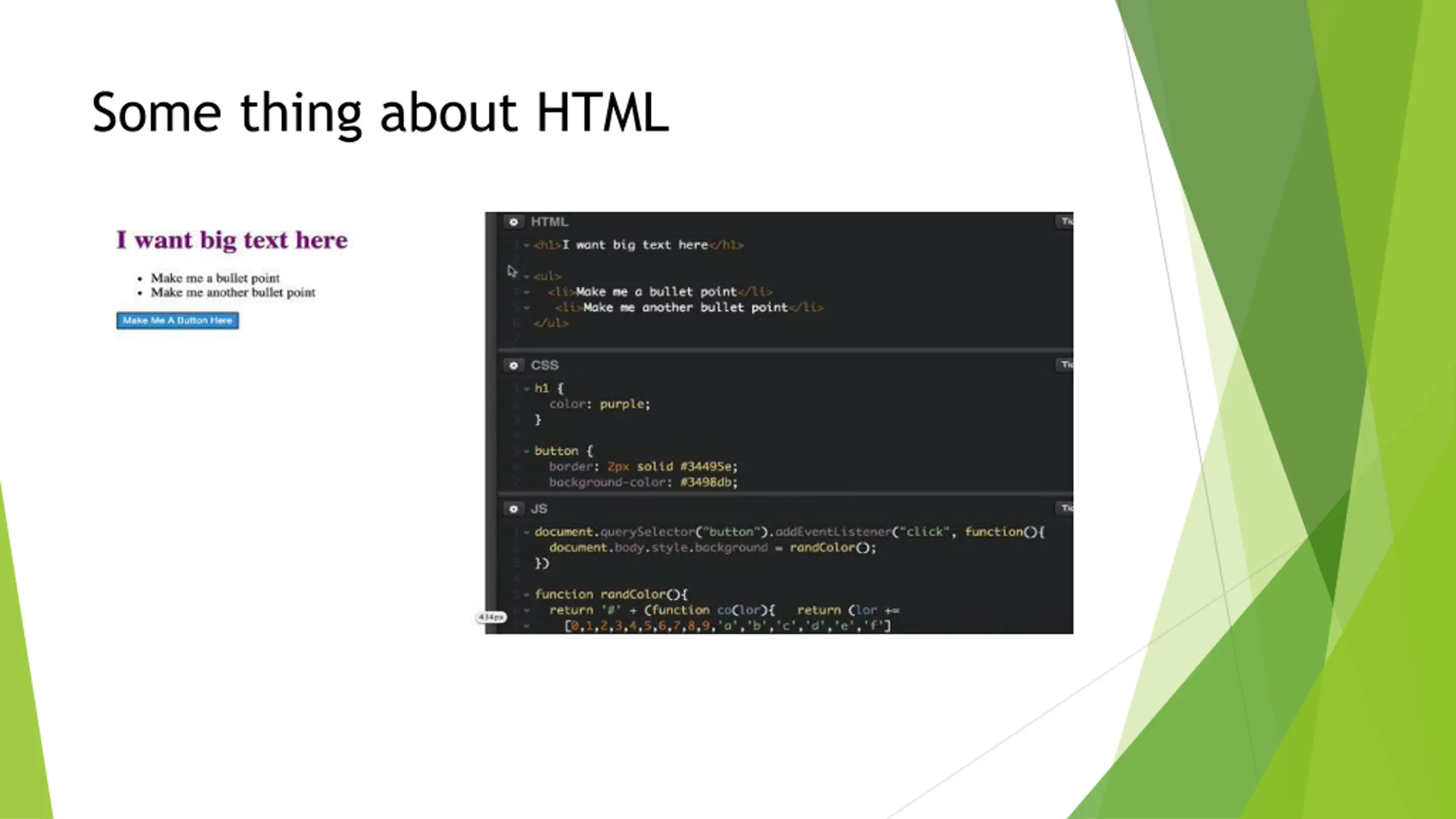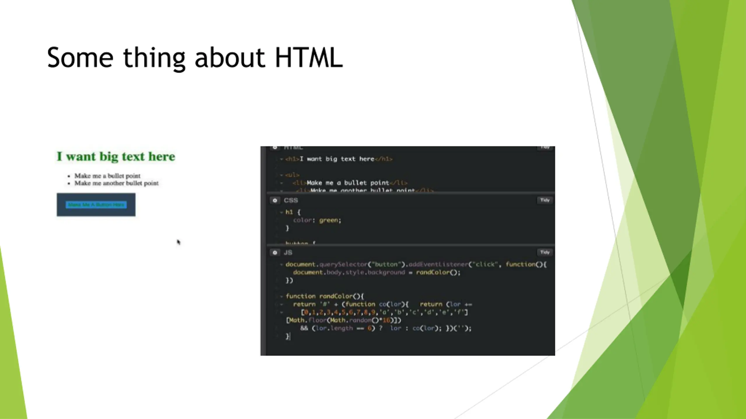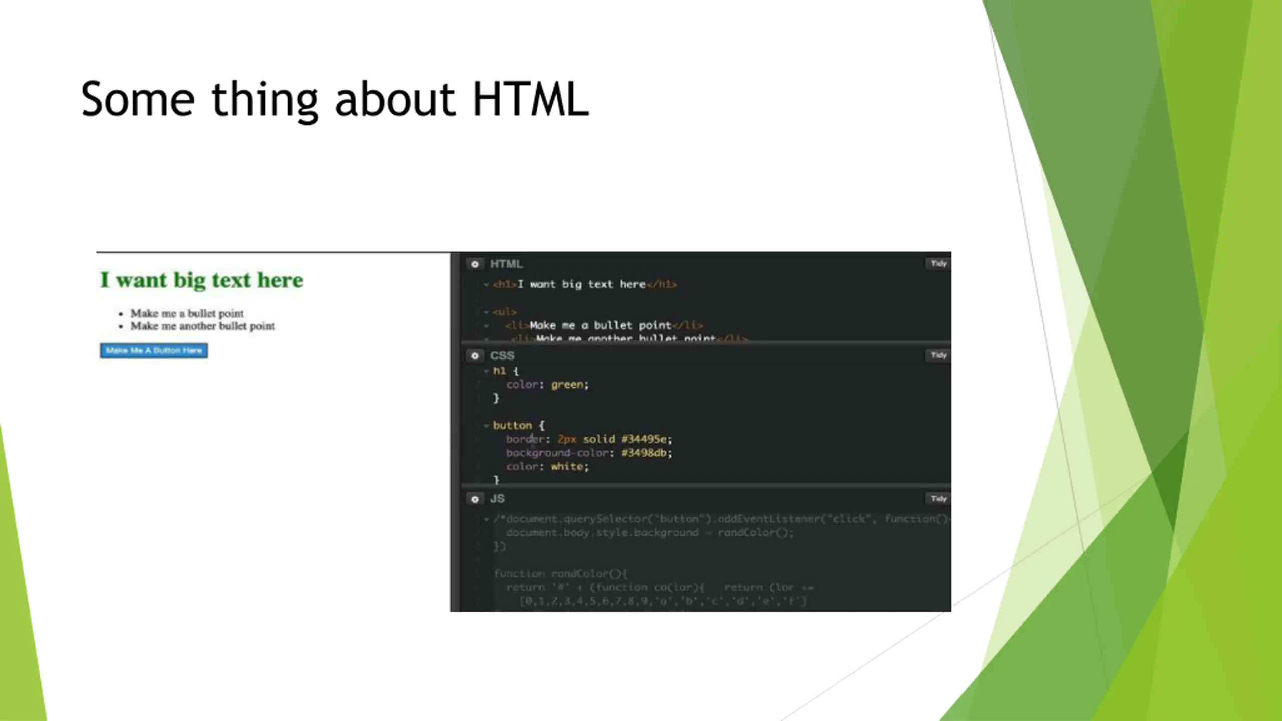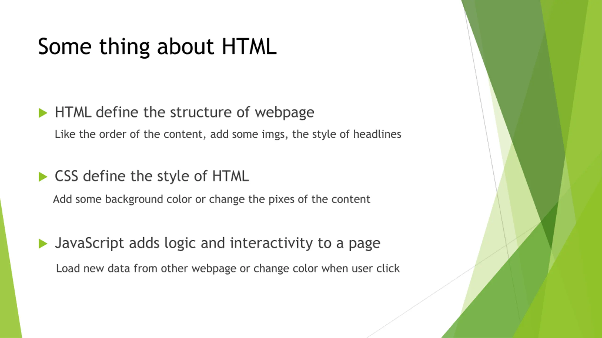 Some thing about HTML HTML define the structure of webpage Like the order of the content, add some imgs, the style of headlines CSS define the style of HTML Add some background color or change the pixes of the content JavaScript adds logic and interactivity to a page Load new data from other webpage or change color when user click