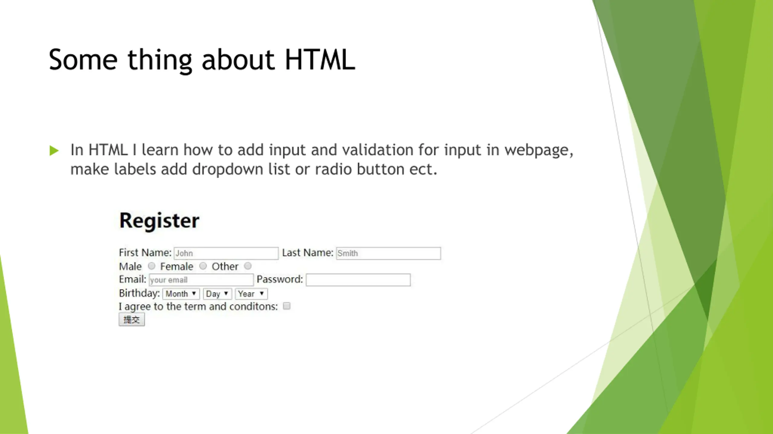 Some thing about HTML In HTML I learn how to add input and validation for input in webpage, make labels add dropdown list or radio button ect.