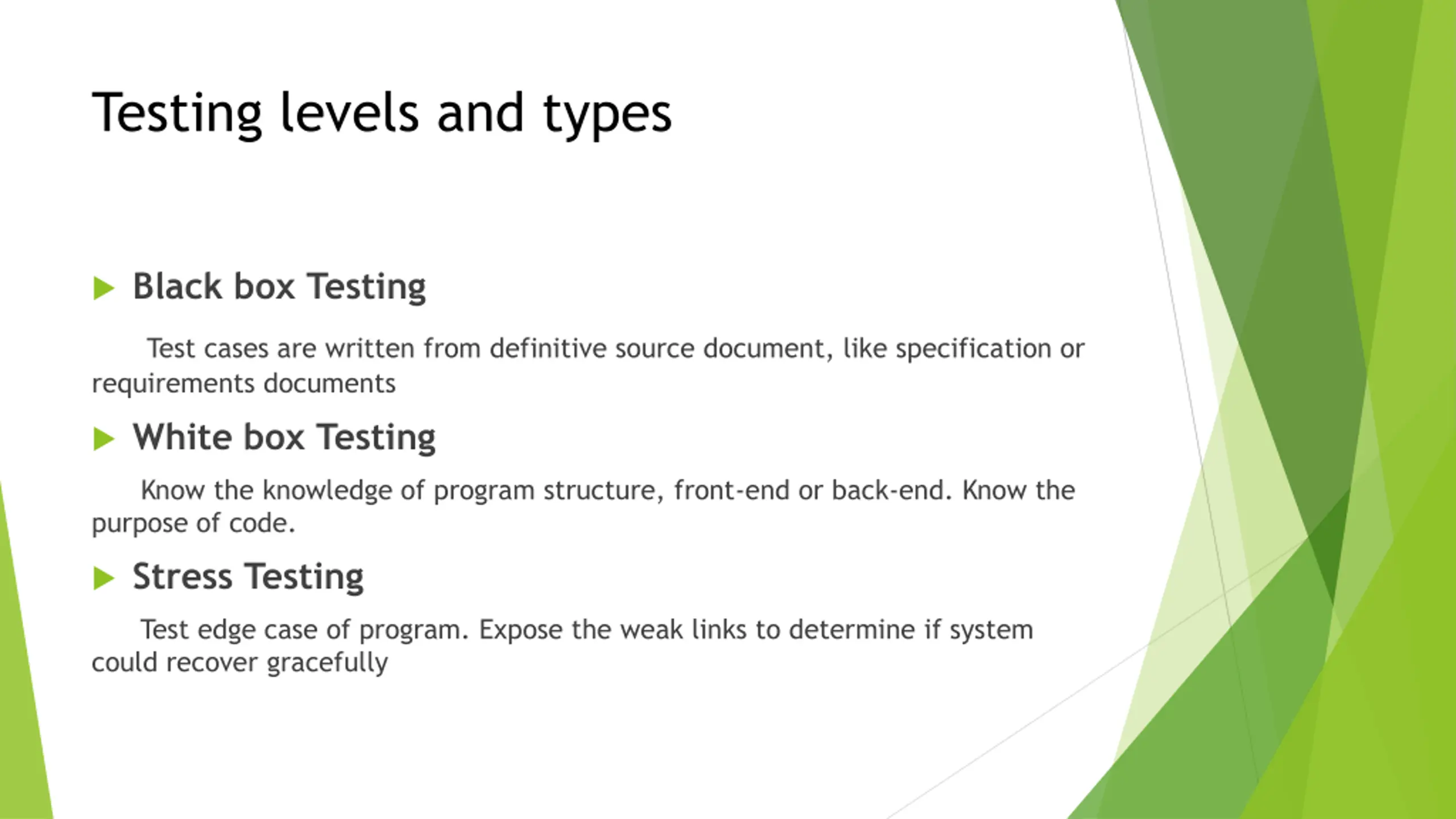 Testing levels and types Black box Testing Test cases are written from definitive source document, like specification or requirements documents White box Testing Know the knowledge of program structure, front-end or back-end. Know the purpose of code. Stress Testing Test edge case of program. Expose the weak links to determine if system could recover gracefully
