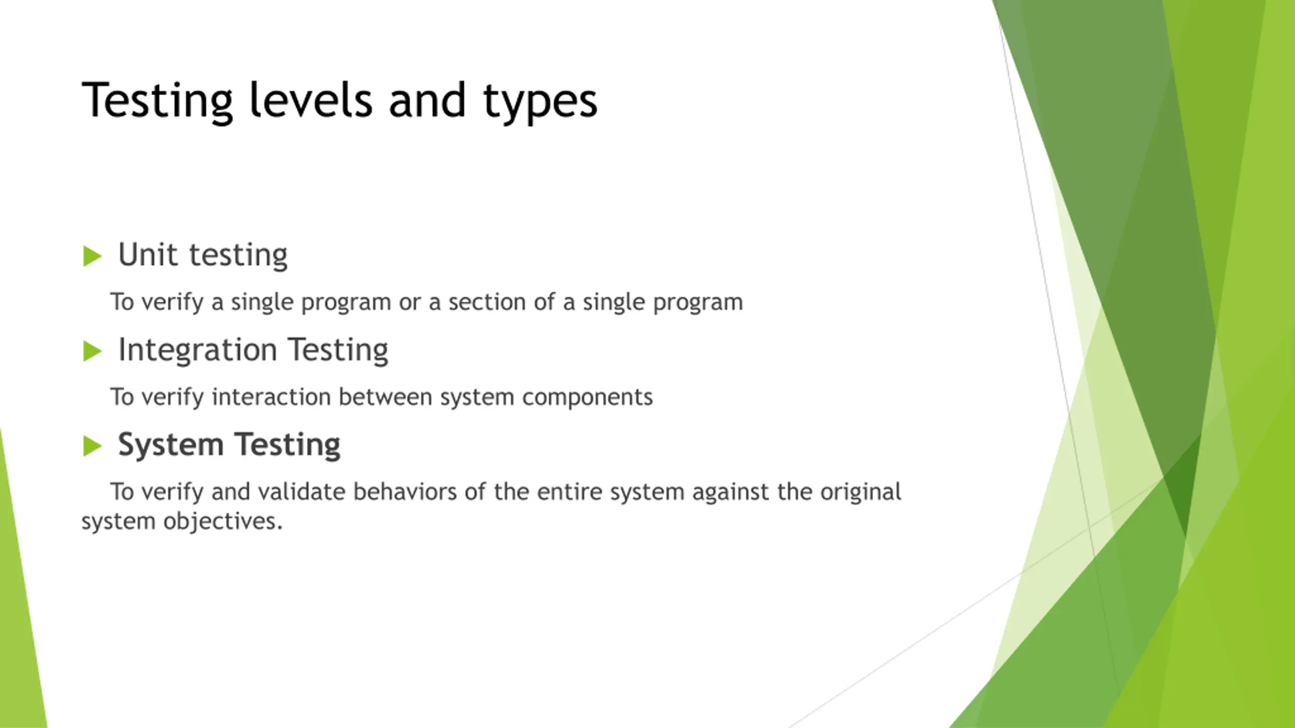 Testing levels and types Unit testing To verify a single program or a section of a single program Integration Testing To verify interaction between system components System Testing To verify and validate behaviors of the entire system against the original system objectives.