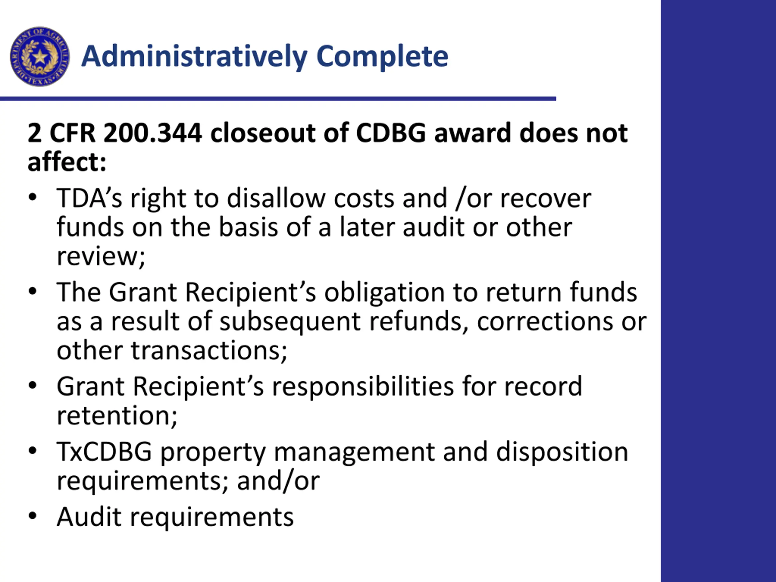 Administratively Complete 2 CFR 200.344 closeout of CDBG award does not affect: TDA s right to disallow costs and /or recover funds on the basis of a later audit or other review; The Grant Recipient s obligation to return funds as a result of subsequent refunds, corrections or other transactions; Grant Recipient s responsibilities for record retention; TxCDBG property management and disposition requirements; and/or Audit requirements