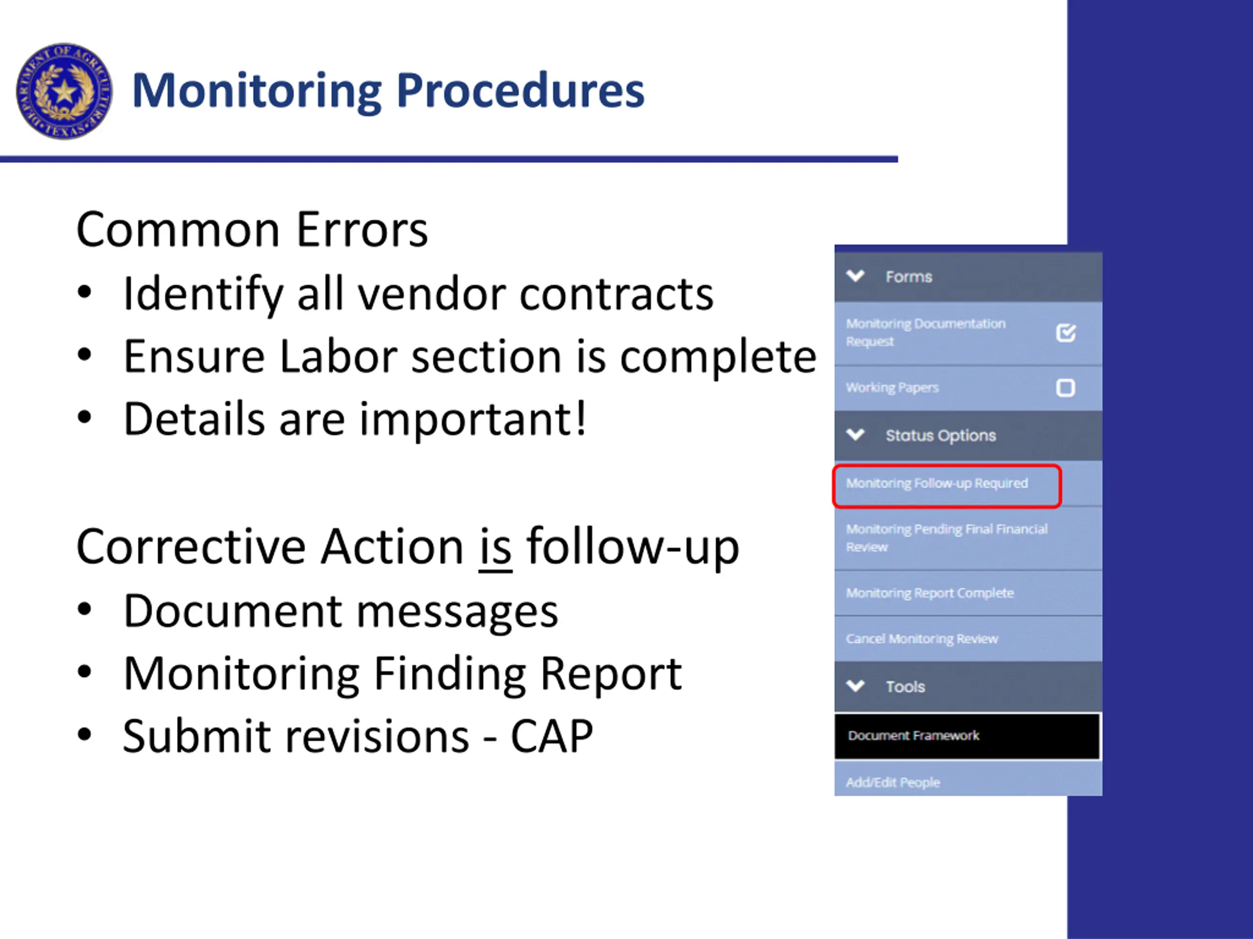 Monitoring Procedures Common Errors Identify all vendor contracts Ensure Labor section is complete Details are important! Corrective Action is follow-up Document messages Monitoring Finding Report Submit revisions - CAP