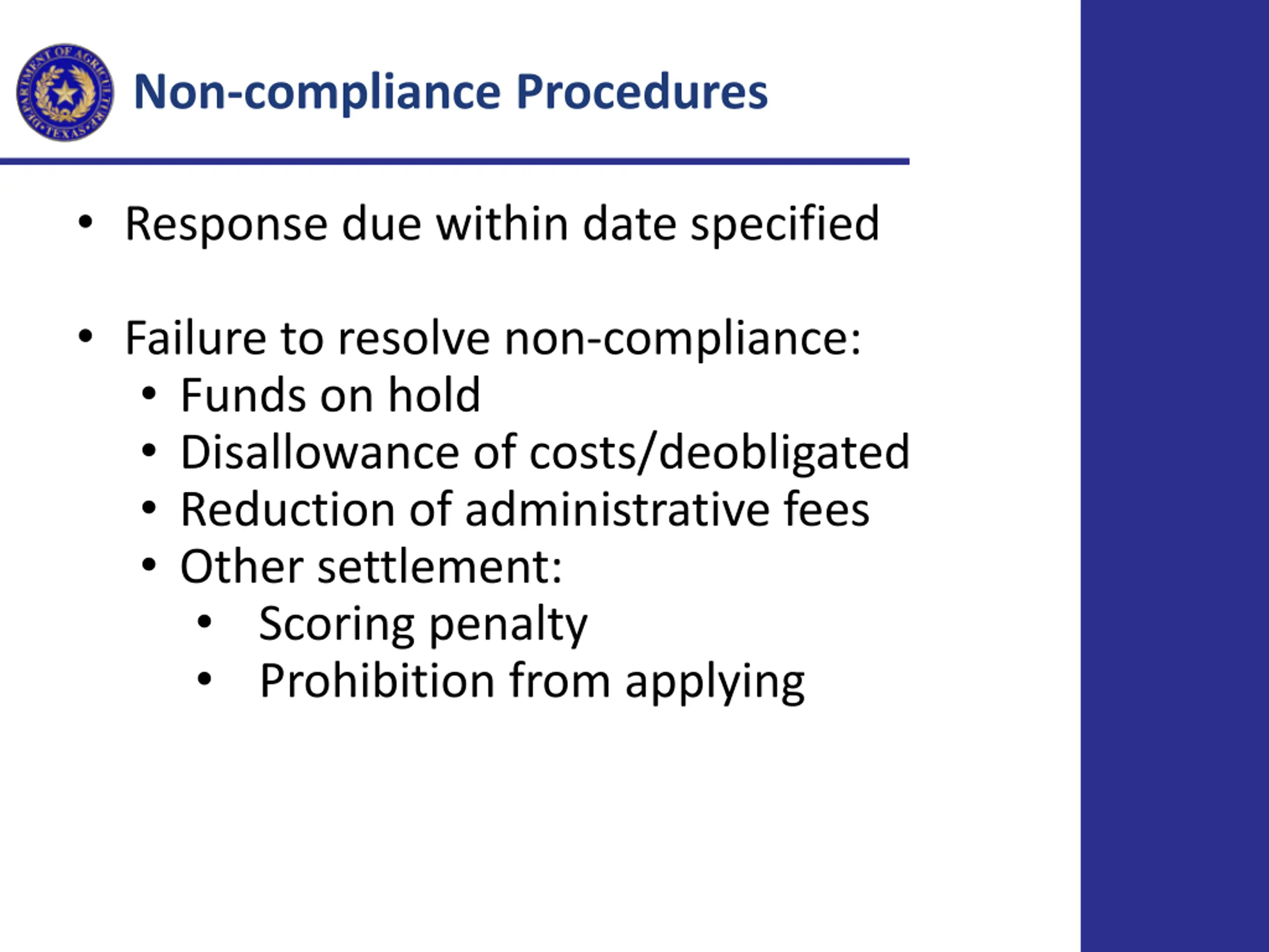 Non-compliance Procedures Response due within date specified Failure to resolve non-compliance: Funds on hold Disallowance of costs/deobligated Reduction of administrative fees Other settlement: Scoring penalty Prohibition from applying