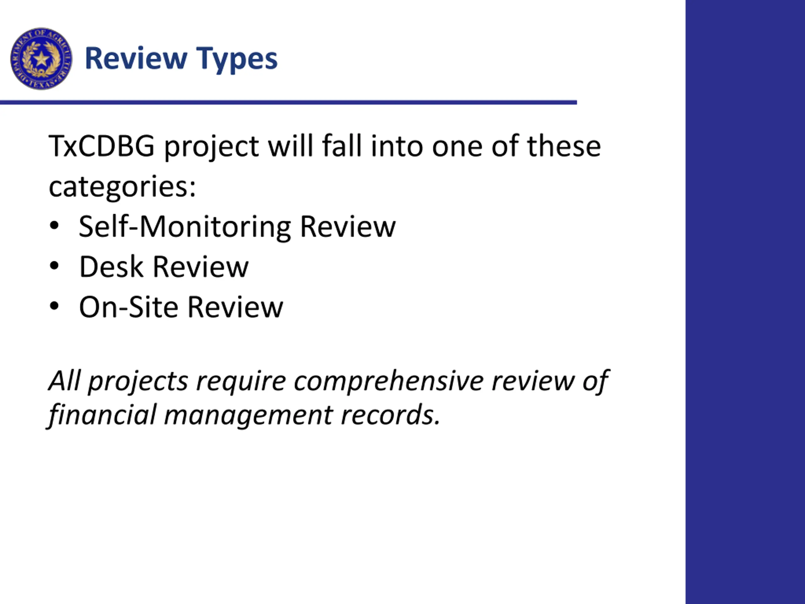 Review Types TxCDBG project will fall into one of these categories: Self-Monitoring Review Desk Review On-Site Review All projects require comprehensive review of financial management records.
