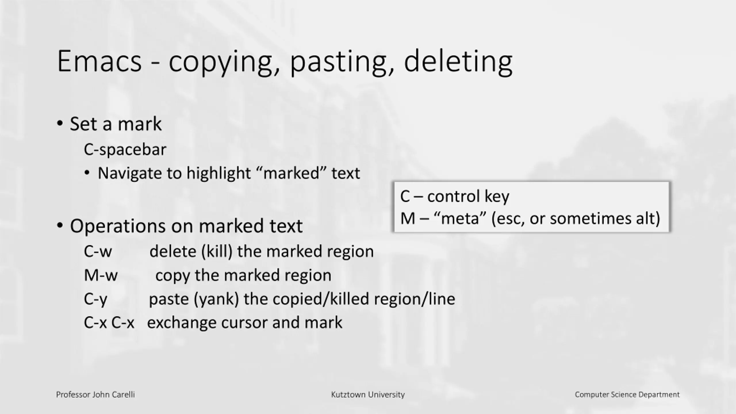 - Emacs - copying, pasting, deleting Set a mark C-spacebar Navigate to highlight marked text C control key M meta (esc, or sometimes alt) Operations on marked text C-w delete (kill) the marked region M-w copy the marked region C-y paste (yank) the copied/killed region/line C-x C-x exchange cursor and mark Professor John Carelli Kutztown University Computer Science Department