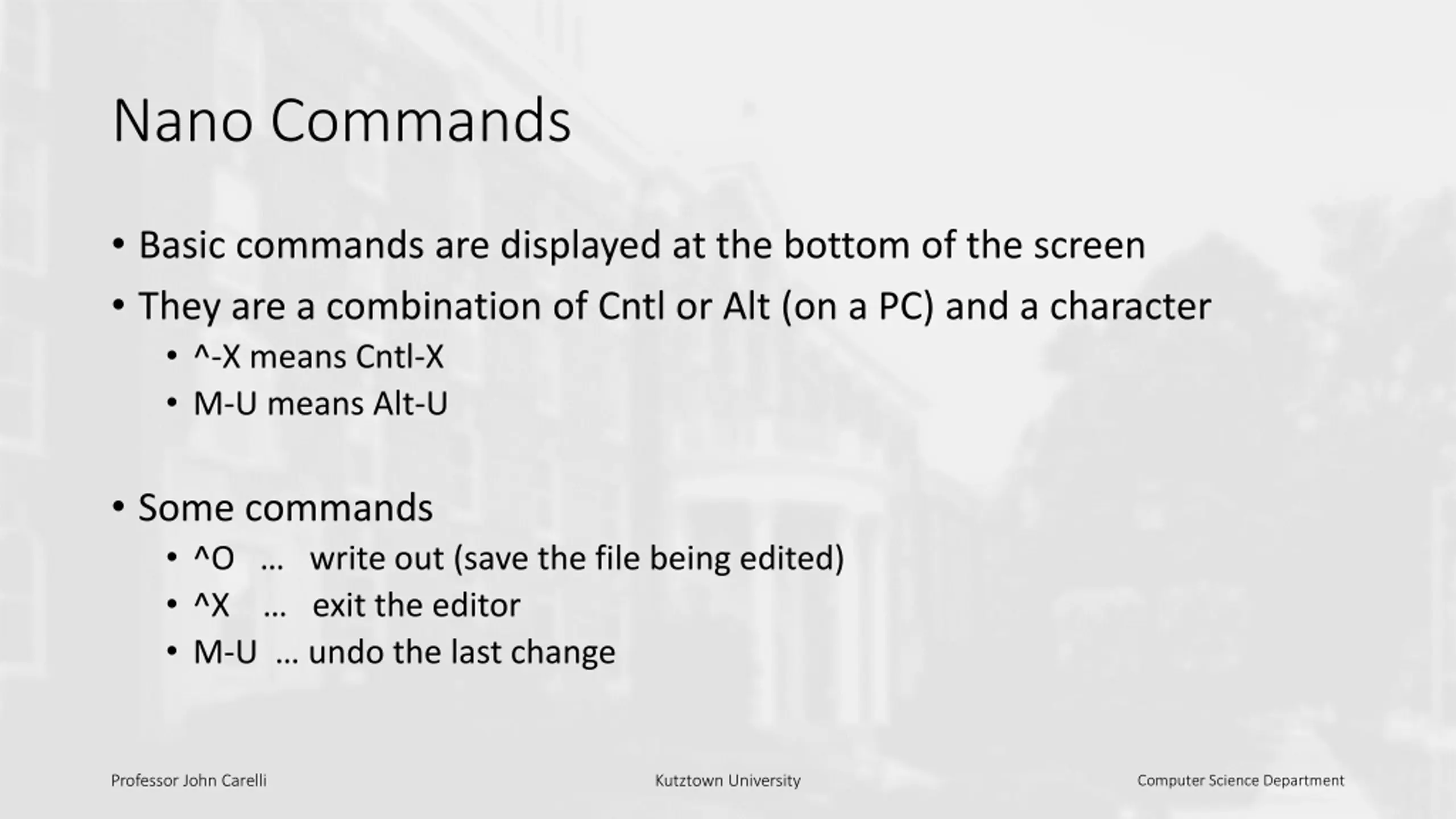 - Nano Commands Basic commands are displayed at the bottom of the screen They are a combination of Cntl or Alt (on a PC) and a character ^-X means Cntl-X M-U means Alt-U Some commands ^O write out (save the file being edited) ^X exit the editor M-U undo the last change Professor John Carelli Kutztown University Computer Science Department