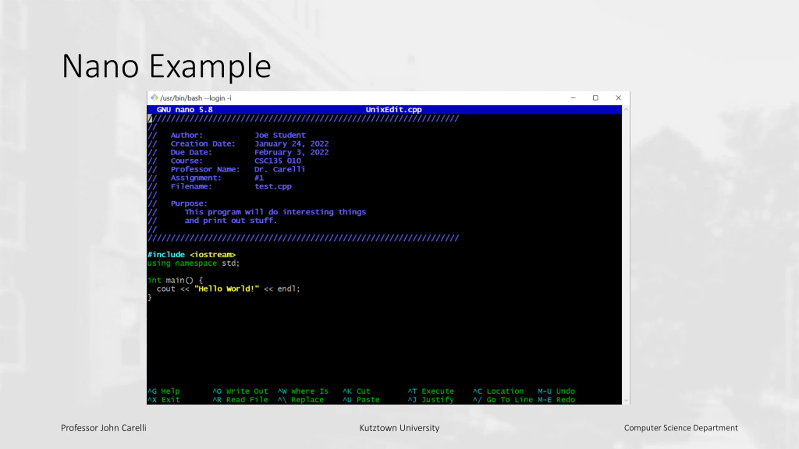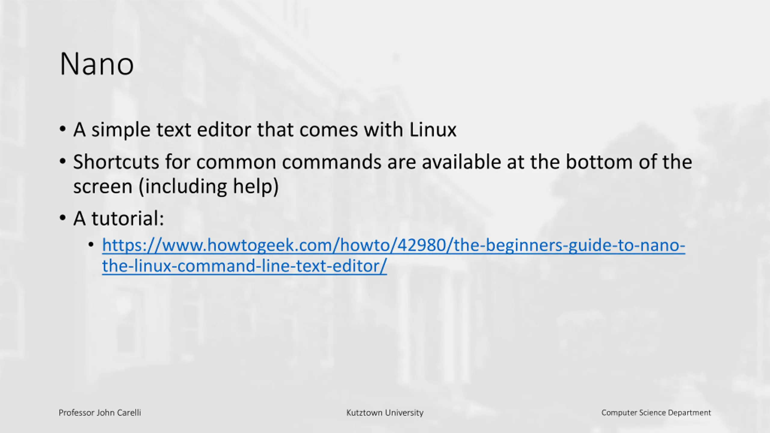 - Nano A simple text editor that comes with Linux Shortcuts for common commands are available at the bottom of the screen (including help) A tutorial: https://www.howtogeek.com/howto/42980/the-beginners-guide-to-nano- the-linux-command-line-text-editor/ Professor John Carelli Kutztown University Computer Science Department