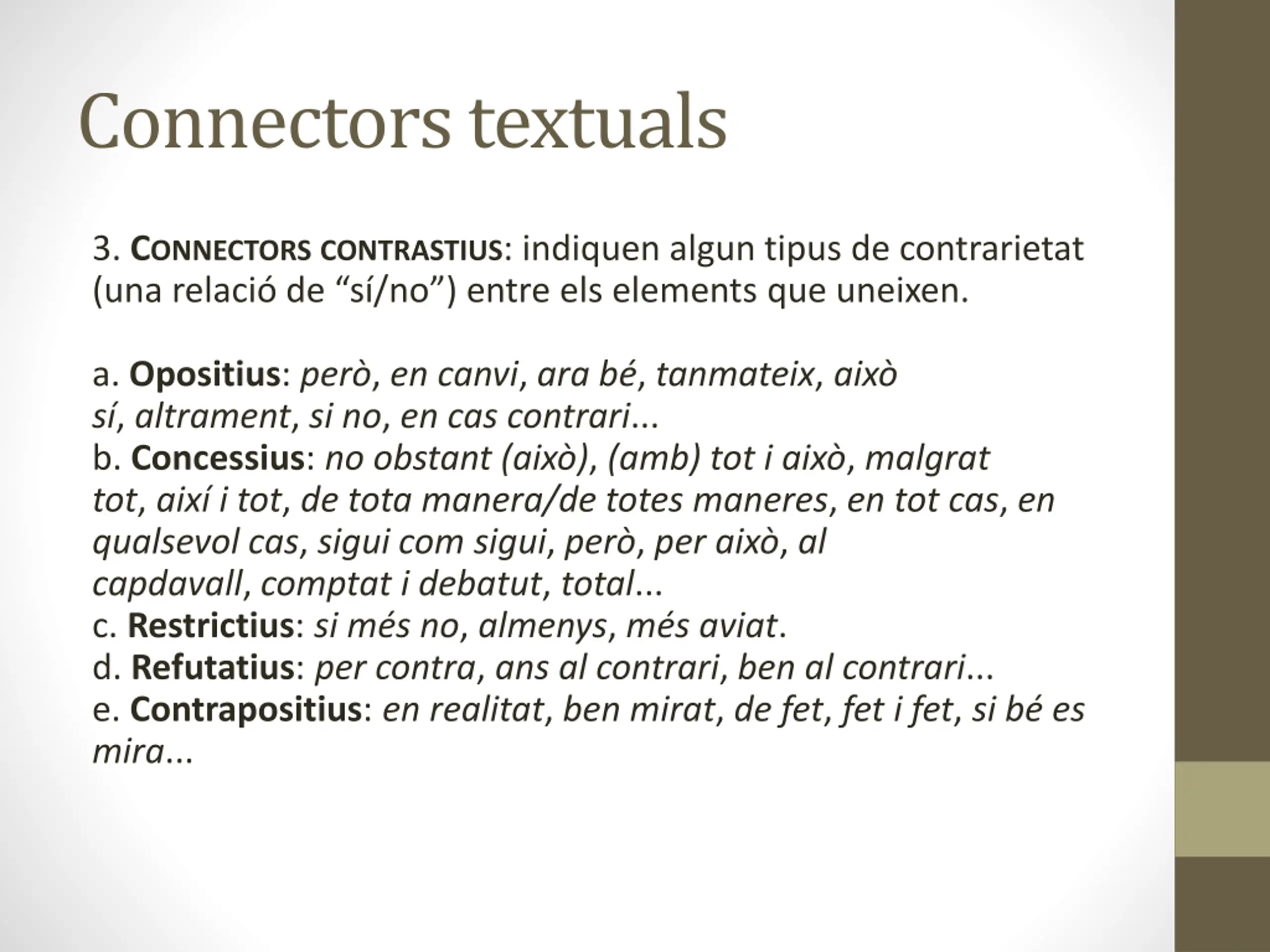 Connectors textuals 3. CONNECTORS CONTRASTIUS: indiquen algun tipus de contrarietat (una relaci de s /no ) entre els elements que uneixen. a. Opositius: per , en canvi, ara b , tanmateix, aix s , altrament, si no, en cas contrari... b. Concessius: no obstant (aix ), (amb) tot i aix , malgrat tot, aix i tot, de tota manera/de totes maneres, en tot cas, en qualsevol cas, sigui com sigui, per , per aix , al capdavall, comptat i debatut, total... c. Restrictius: si m s no, almenys, m s aviat. d. Refutatius: per contra, ans al contrari, ben al contrari... e. Contrapositius: en realitat, ben mirat, de fet, fet i fet, si b es mira...