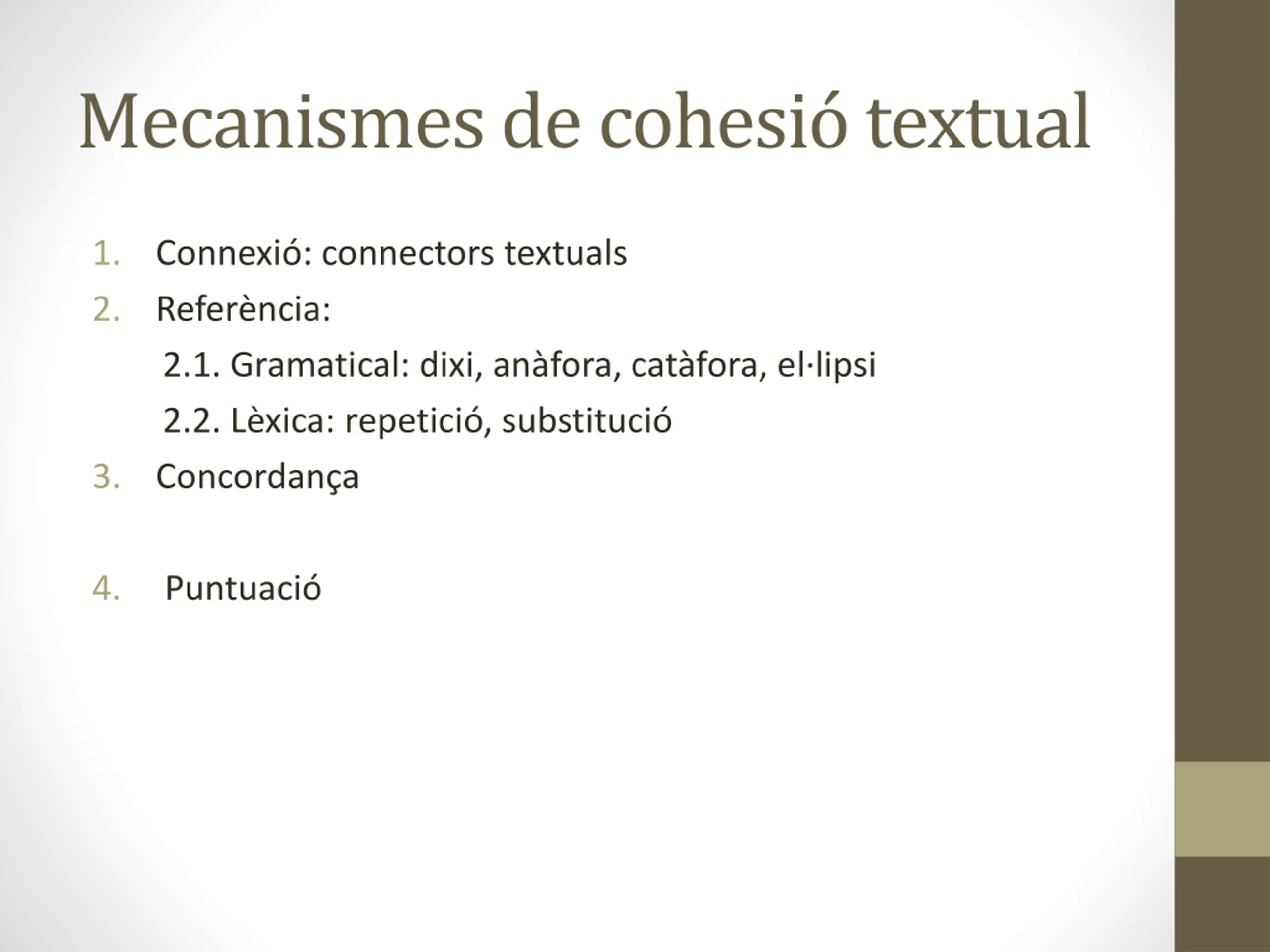 Mecanismes de cohesi textual 1. Connexi : connectors textuals 2. Refer ncia: 2.1. Gramatical: dixi, an fora, cat fora, el lipsi 2.2. L xica: repetici , substituci 3. Concordan a 4. Puntuaci