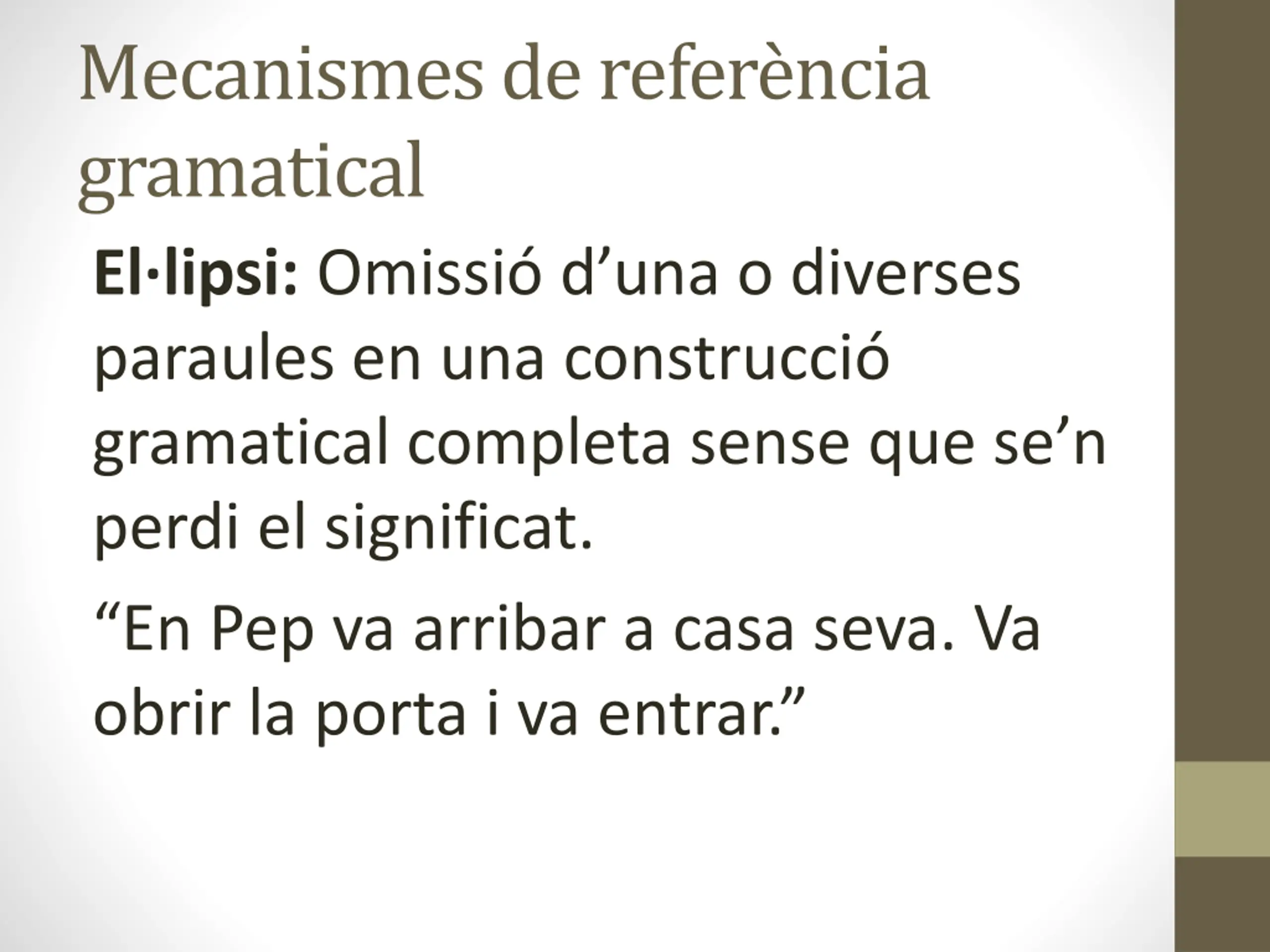 Mecanismes de referncia gramatical El lipsi: Omissi d una o diverses paraules en una construcci gramatical completa sense que se n perdi el significat. En Pep va arribar a casa seva. Va obrir la porta i va entrar.