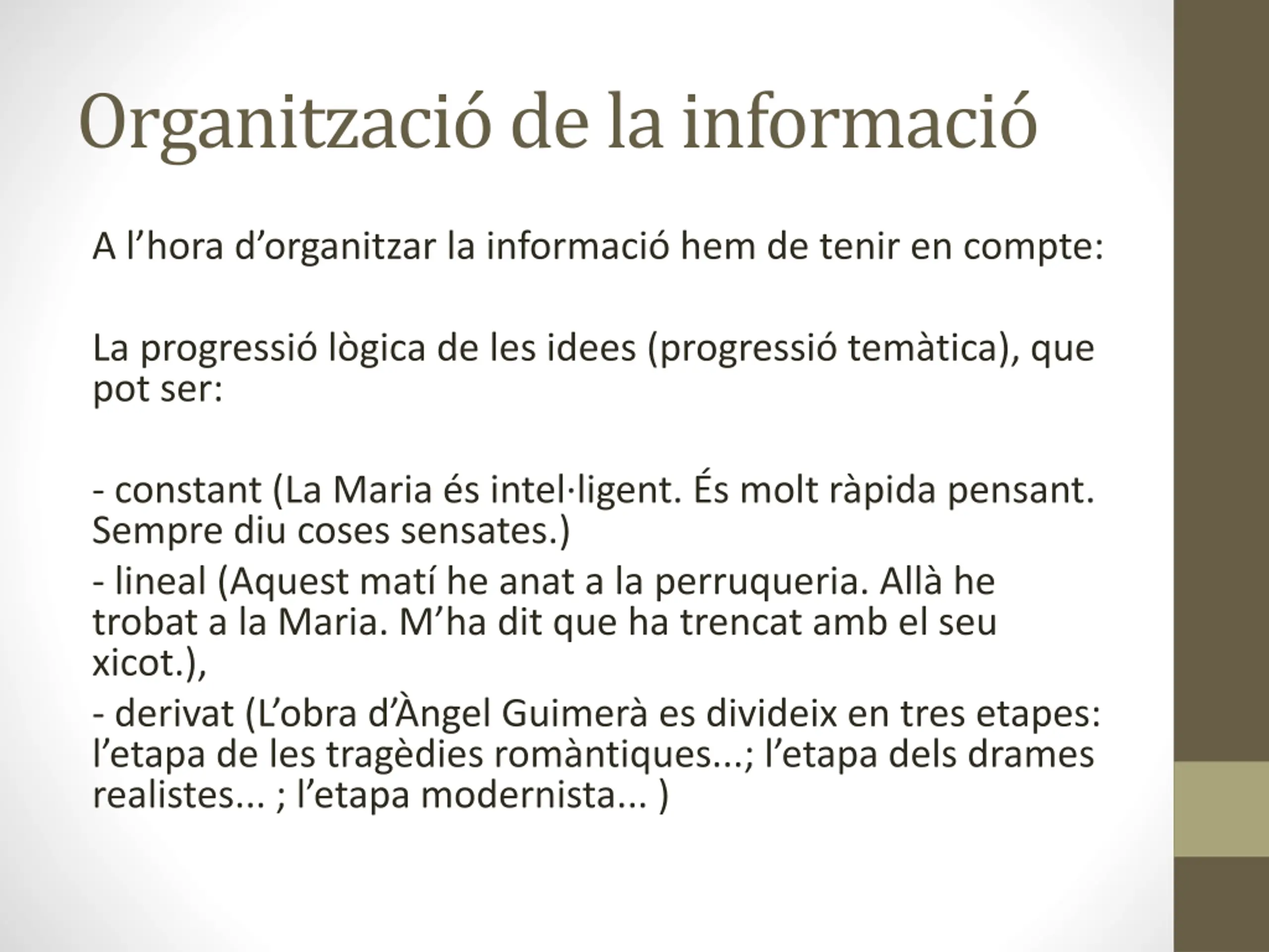 Organitzaci de la informaci A l hora d organitzar la informaci hem de tenir en compte: La progressi l gica de les idees (progressi tem tica), que pot ser: - constant (La Maria s intel ligent. s molt r pida pensant. Sempre diu coses sensates.) - lineal (Aquest mat he anat a la perruqueria. All he trobat a la Maria. M ha dit que ha trencat amb el seu xicot.), - derivat (L obra d ngel Guimer es divideix en tres etapes: l etapa de les trag dies rom ntiques...; l etapa dels drames realistes... ; l etapa modernista... )