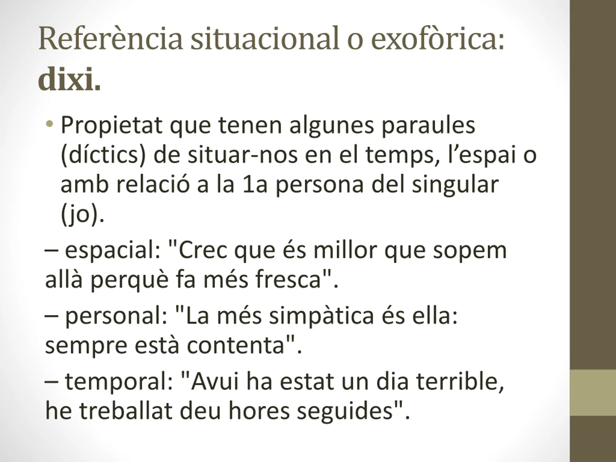 Referncia situacionalo exofrica: dixi. Propietat que tenen algunes paraules (d ctics) de situar-nos en el temps, l espai o amb relaci a la 1a persona del singular (jo). espacial: "Crec que s millor que sopem all perqu fa m s fresca". personal: "La m s simp tica s ella: sempre est contenta". temporal: "Avui ha estat un dia terrible, he treballat deu hores seguides".