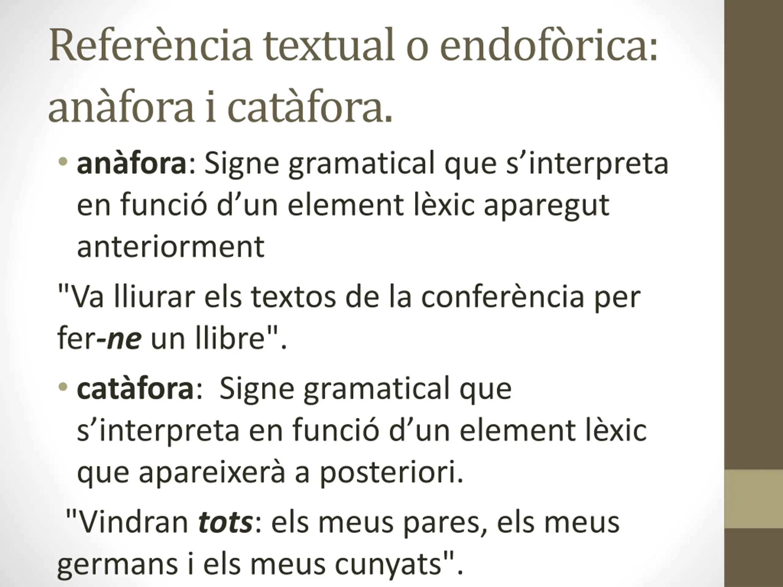 Referncia textual o endofrica: an fora i cat fora. an fora: Signe gramatical que s interpreta en funci d un element l xic aparegut anteriorment "Va lliurar els textos de la confer ncia per fer-ne un llibre". cat fora: Signe gramatical que s interpreta en funci d un element l xic que apareixer a posteriori. "Vindran tots: els meus pares, els meus germans i els meus cunyats".