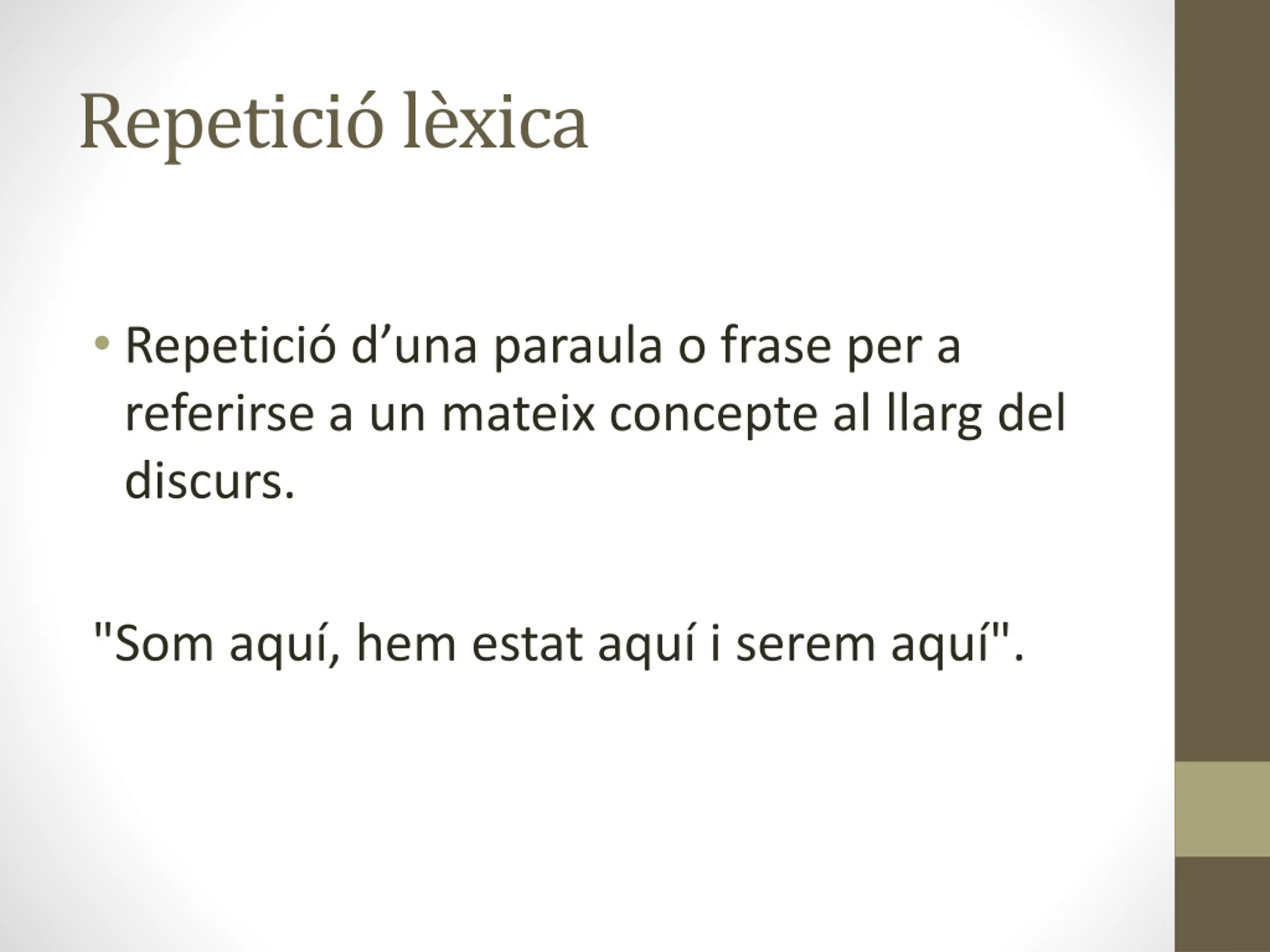Repetici lxica Repetici d una paraula o frase per a referirse a un mateix concepte al llarg del discurs. "Som aqu , hem estat aqu i serem aqu ".