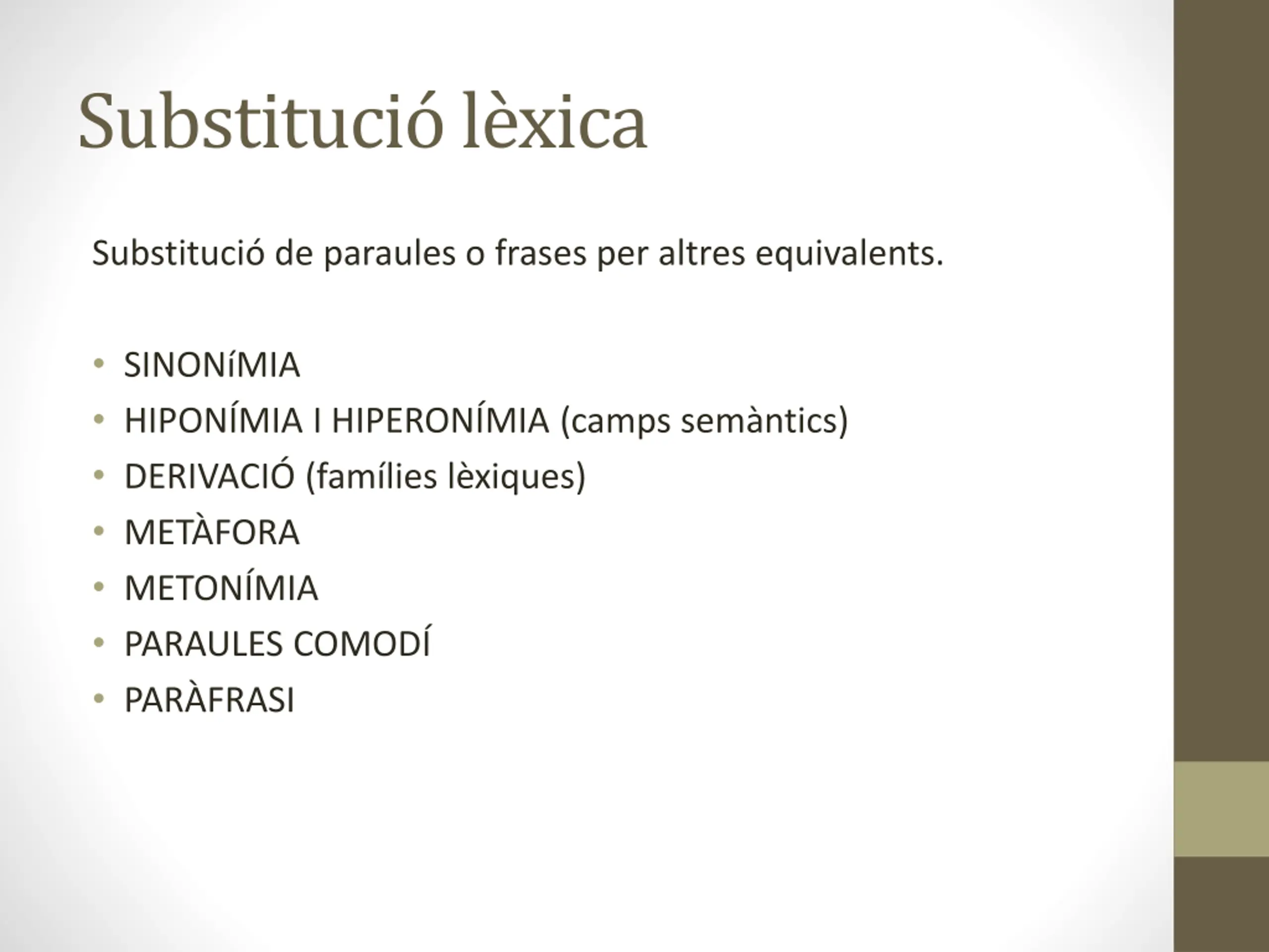 Substituci lxica Substituci de paraules o frases per altres equivalents. SINON MIA HIPON MIA I HIPERON MIA (camps sem ntics) DERIVACI (fam lies l xiques) MET FORA METON MIA PARAULES COMOD PAR FRASI