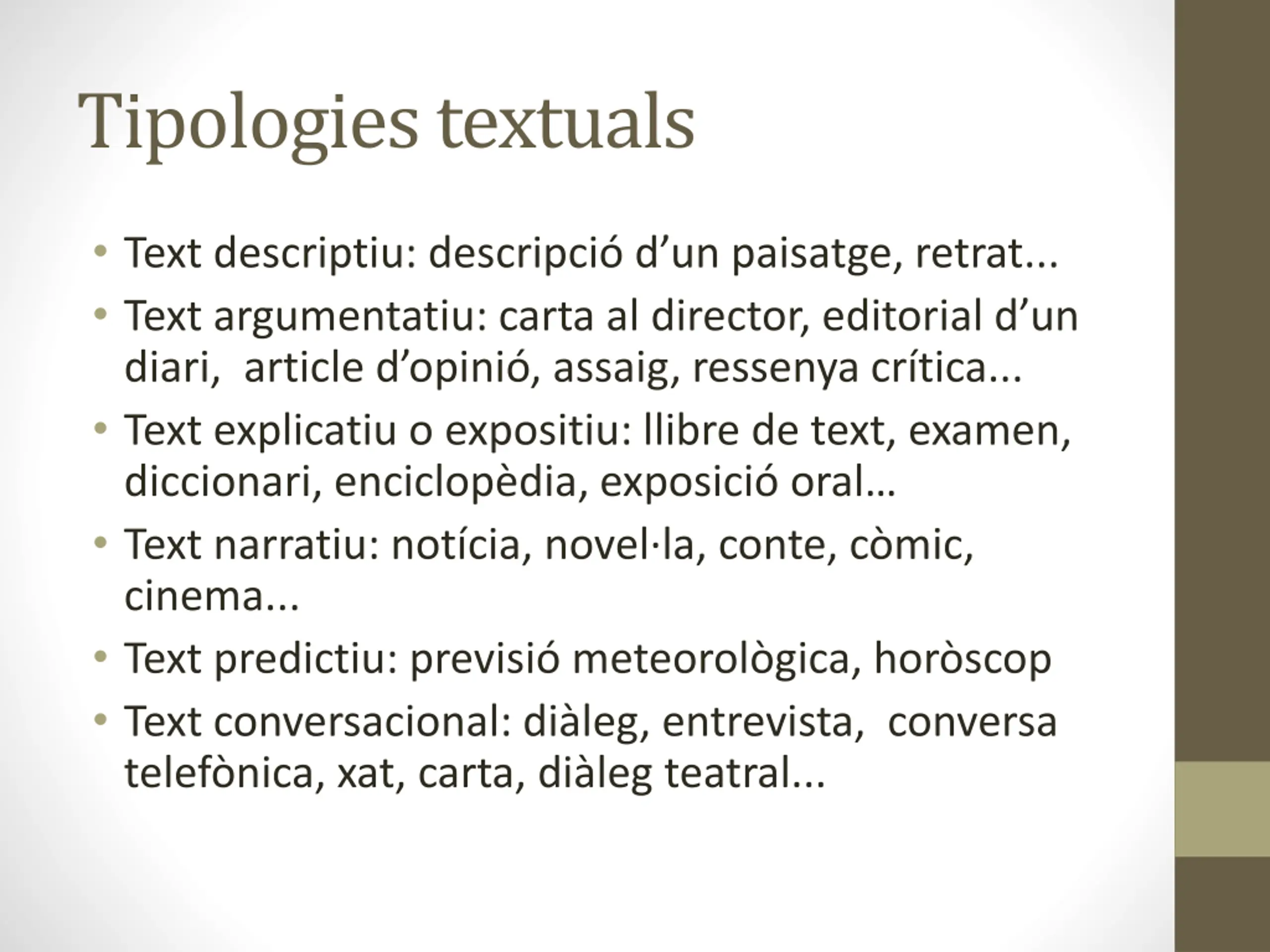 Tipologies textuals Text descriptiu: descripci d un paisatge, retrat... Text argumentatiu: carta al director, editorial d un diari, article d opini , assaig, ressenya cr tica... Text explicatiu o expositiu: llibre de text, examen, diccionari, enciclop dia, exposici oral Text narratiu: not cia, novel la, conte, c mic, cinema... Text predictiu: previsi meteorol gica, hor scop Text conversacional: di leg, entrevista, conversa telef nica, xat, carta, di leg teatral...