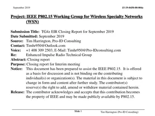 Novemner 2019 doc.: IEEE802.15-19-0585-00-004z Project: IEEE P802.15 Working Group for Wireless Personal Area Networks (WPANs) Submission Title: TG4z November Closing Report Date Submitted: 5-Dec-2019 Source: Benjamin A. Rolfe Company: Blind Creek Associates Address: PO Box 798 Los Gatos CA 95031 Voice: +1 408 332 0725, E-Mail: ben.rolfe @ ieee.com Re: November plenary meeting closing report Abstract: Closing report Purpose: Entertain and inform working group of TG activities Notice: for discussion and is not binding on the contributing individual(s) or organization(s). The material in this document is subject to change in form and content after further study. The contributor(s) reserve(s) the right to add, amend or withdraw material contained herein. Release: The contributor acknowledges and accepts that this contribution becomes the property of IEEE and may be made publicly available by P802.15. This document has been prepared to assist the IEEE P802.15. It is offered as a basis Benjamin Rolfe, Blind Creek Associates Slide 1 Submission