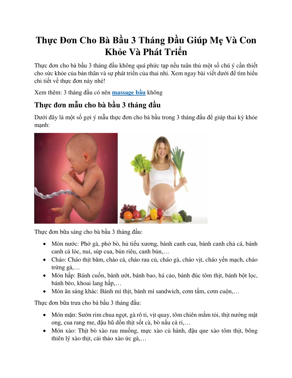 Trong 3 thu00e1ng u0111u1ea7u thai ku1ef3 viu1ec7c chu0103m su00f3c dinh du01b0u1ee1ng lu00e0 u0111u1eb7c biu1ec7t quan tru1ecdng vu1edbi su1ef1 phu00e1t triu1ec3n cu1ee7a em bu00e9 vu00e0 su1ee9c khu1ecfe cu1ee7a mu1eb9. Bu
