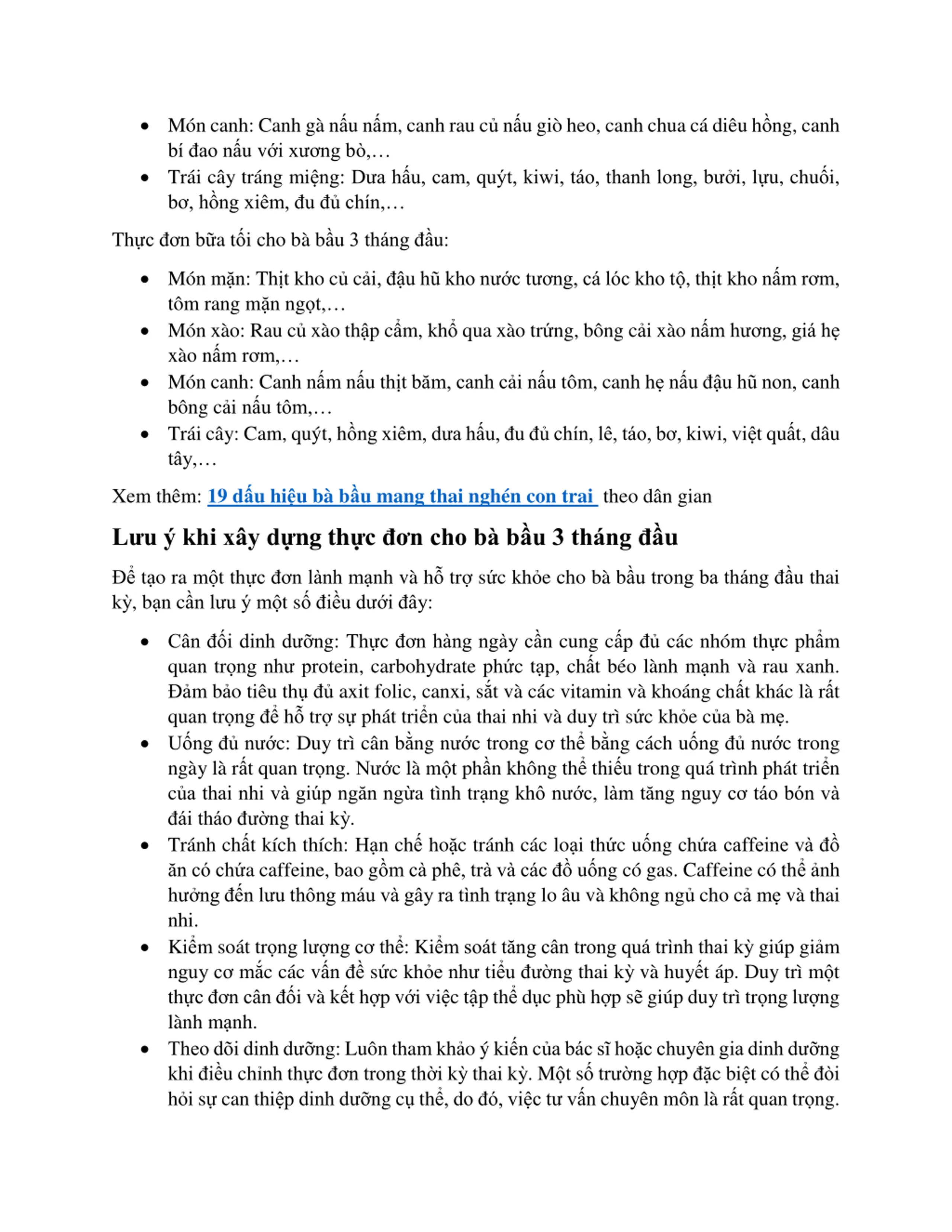 Mn canh: Canh g nu nm, canh rau c nu gi heo, canh chua c diu hng, canh b ao n u v i x ng b , Tr i c y tr ng mi ng: D a h u, cam, qu t, kiwi, t o, thanh long, b i, l u, chu i, b , h ng xi m, u ch n, Th c n b a t i cho b b u 3 th ng u: M n m n: Th t kho c c i, u h kho n c t ng, c l c kho t , th t kho n m r m, t m rang m n ng t, M n x o: Rau c x o th p c m, kh qua x o tr ng, b ng c i x o n m h ng, gi h x o n m r m, M n canh: Canh n m n u th t b m, canh c i n u t m, canh h n u u h non, canh b ng c i n u t m, Tr i c y: Cam, qu t, h ng xi m, d a h u, u ch n, l , t o, b , kiwi, vi t qu t, d u t y, Xem th m: 19 d u hi u b b u mang thai ngh n con trai theo d n gian L u khi x y d ng th c n cho b b u 3 th ng u t o ra m t th c n l nh m nh v h tr s c kh e cho b b u trong ba th ng u thai k , b n c n l u m t s i u d i y: C n i dinh d ng: Th c n h ng ng y c n cung c p c c nh m th c ph m quan tr ng nh protein, carbohydrate ph c t p, ch t b o l nh m nh v rau xanh. m b o ti u th axit folic, canxi, s t v c c vitamin v kho ng ch t kh c l r t quan tr ng h tr s ph t tri n c a thai nhi v duy tr s c kh e c a b m . U ng n c: Duy tr c n b ng n c trong c th b ng c ch u ng n c trong ng y l r t quan tr ng. N c l m t ph n kh ng th thi u trong qu tr nh ph t tri n c a thai nhi v gi p ng n ng a t nh tr ng kh n c, l m t ng nguy c t o b n v i th o ng thai k . Tr nh ch t k ch th ch: H n ch ho c tr nh c c lo i th c u ng ch a caffeine v n c ch a caffeine, bao g m c ph , tr v c c u ng c gas. Caffeine c th nh h ng n l u th ng m u v g y ra t nh tr ng lo u v kh ng ng cho c m v thai nhi. Ki m so t tr ng l ng c th : Ki m so t t ng c n trong qu tr nh thai k gi p gi m nguy c m c c c v n s c kh e nh ti u ng thai k v huy t p. Duy tr m t th c n c n i v k t h p v i vi c t p th d c ph h p s gi p duy tr tr ng l ng l nh m nh. Theo d i dinh d ng: Lu n tham kh o ki n c a b c s ho c chuy n gia dinh d ng khi i u ch nh th c n trong th i k thai k . M t s tr ng h p c bi t c th i h i s can thi p dinh d ng c th , do , vi c t v n chuy n m n l r t quan tr ng.