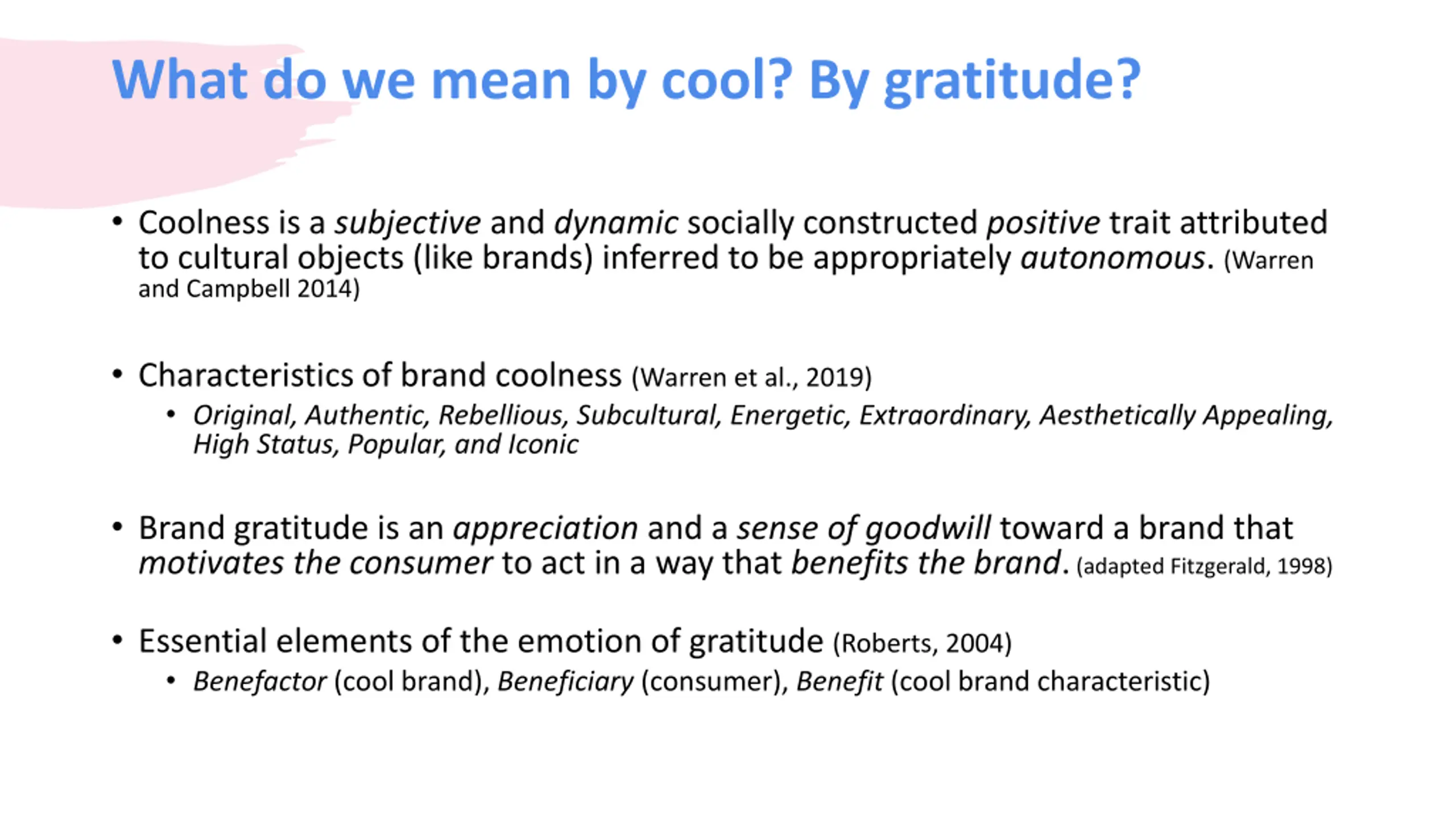 What do we mean by cool? By gratitude? Coolness is a subjective and dynamic socially constructed positive trait attributed to cultural objects (like brands) inferred to be appropriately autonomous. (Warren and Campbell 2014) Characteristics of brand coolness (Warren et al., 2019) Original, Authentic, Rebellious, Subcultural, Energetic, Extraordinary, Aesthetically Appealing, High Status, Popular, and Iconic Brand gratitude is an appreciation and a sense of goodwill toward a brand that motivates the consumer to act in a way that benefits the brand. (adapted Fitzgerald, 1998) Essential elements of the emotion of gratitude (Roberts, 2004) Benefactor (cool brand), Beneficiary (consumer), Benefit (cool brand characteristic)