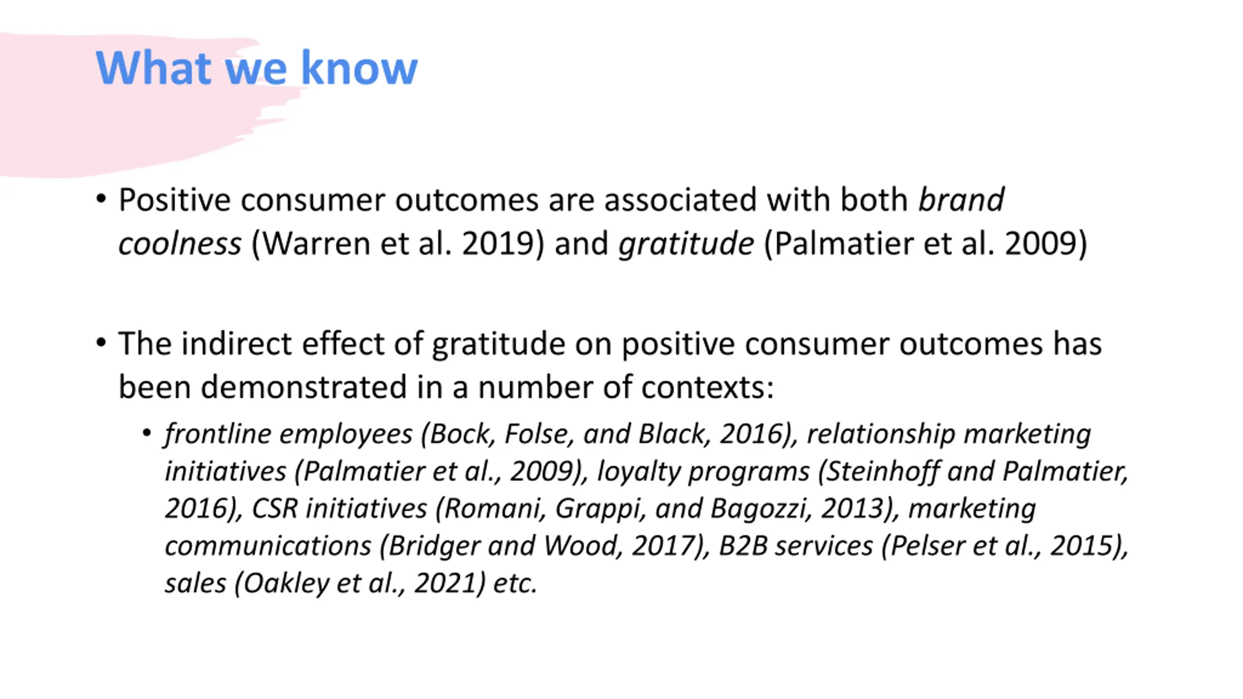What we know Positive consumer outcomes are associated with both brand coolness (Warren et al. 2019) and gratitude (Palmatier et al. 2009) The indirect effect of gratitude on positive consumer outcomes has been demonstrated in a number of contexts: frontline employees (Bock, Folse, and Black, 2016), relationship marketing initiatives (Palmatier et al., 2009), loyalty programs (Steinhoff and Palmatier, 2016), CSR initiatives (Romani, Grappi, and Bagozzi, 2013), marketing communications (Bridger and Wood, 2017), B2B services (Pelser et al., 2015), sales (Oakley et al., 2021) etc.
