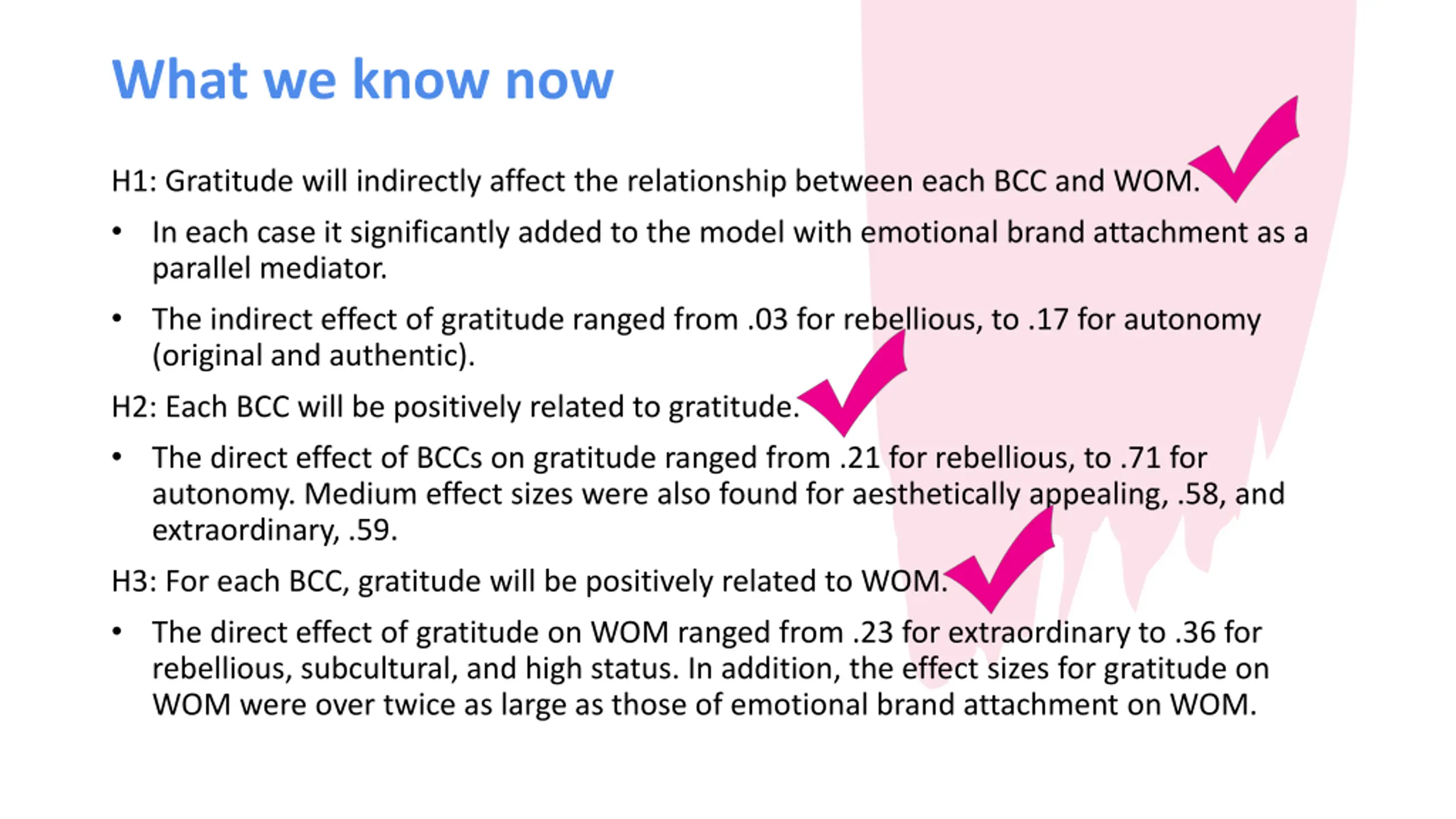 What we know now H1: Gratitude will indirectly affect the relationship between each BCC and WOM. In each case it significantly added to the model with emotional brand attachment as a parallel mediator. The indirect effect of gratitude ranged from .03 for rebellious, to .17 for autonomy (original and authentic). H2: Each BCC will be positively related to gratitude. The direct effect of BCCs on gratitude ranged from .21 for rebellious, to .71 for autonomy. Medium effect sizes were also found for aesthetically appealing, .58, and extraordinary, .59. H3: For each BCC, gratitude will be positively related to WOM. The direct effect of gratitude on WOM ranged from .23 for extraordinary to .36 for rebellious, subcultural, and high status. In addition, the effect sizes for gratitude on WOM were over twice as large as those of emotional brand attachment on WOM.