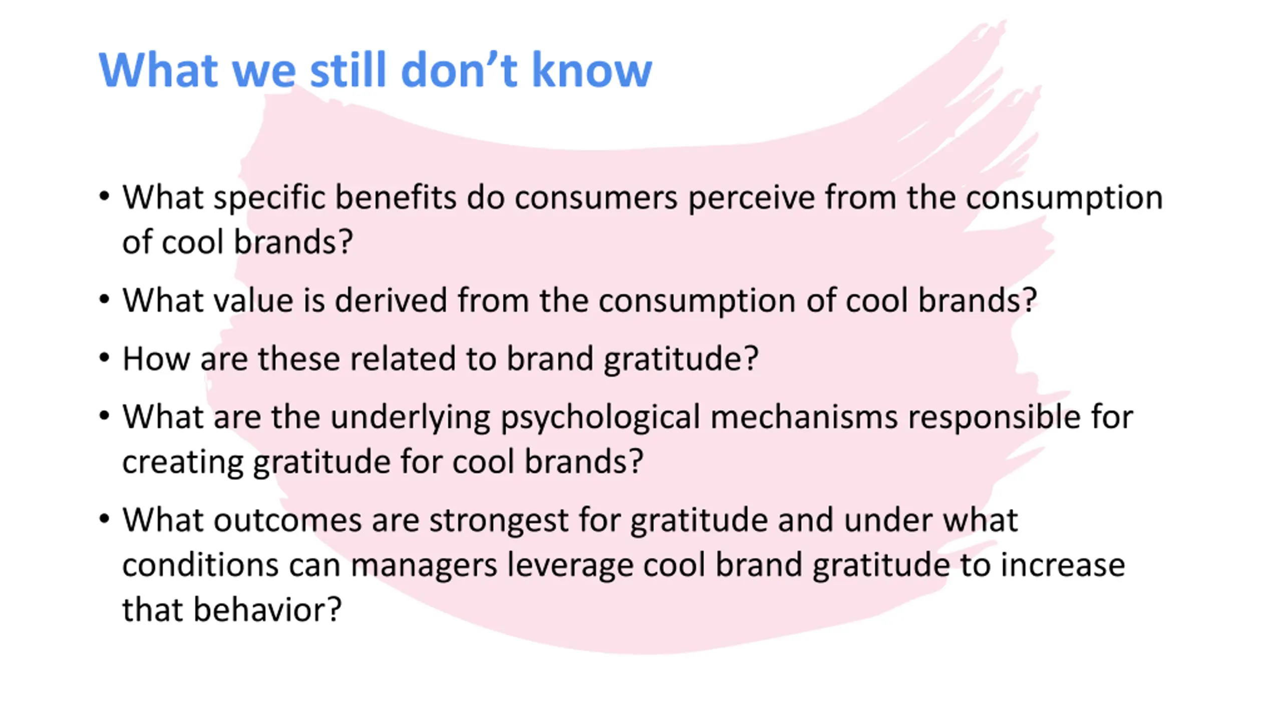 What we still dont know What specific benefits do consumers perceive from the consumption of cool brands? What value is derived from the consumption of cool brands? How are these related to brand gratitude? What are the underlying psychological mechanisms responsible for creating gratitude for cool brands? What outcomes are strongest for gratitude and under what conditions can managers leverage cool brand gratitude to increase that behavior?