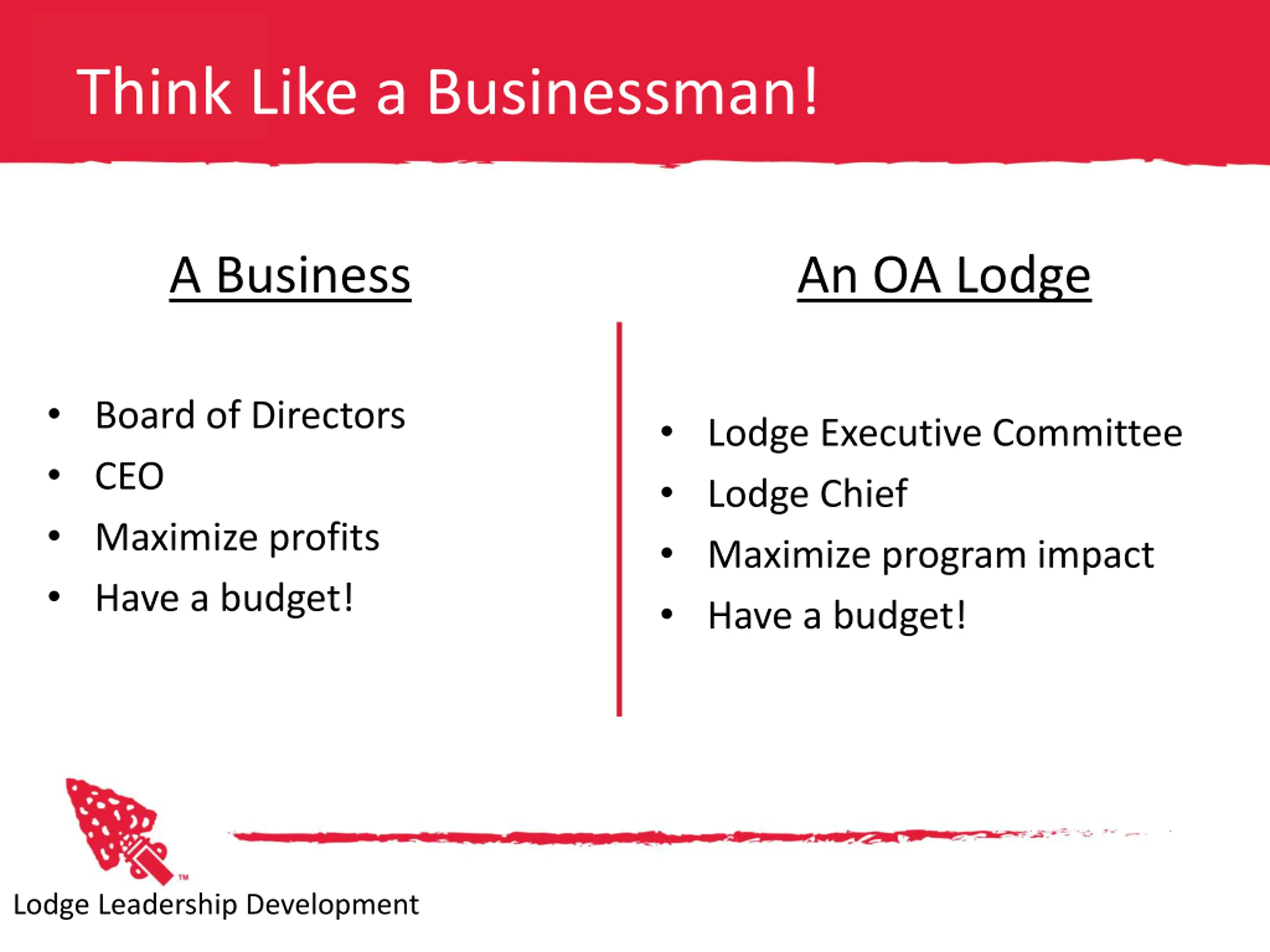 Think Like a Businessman! A Business An OA Lodge Board of Directors CEO Maximize profits Have a budget! Lodge Executive Committee Lodge Chief Maximize program impact Have a budget! Lodge Leadership Development