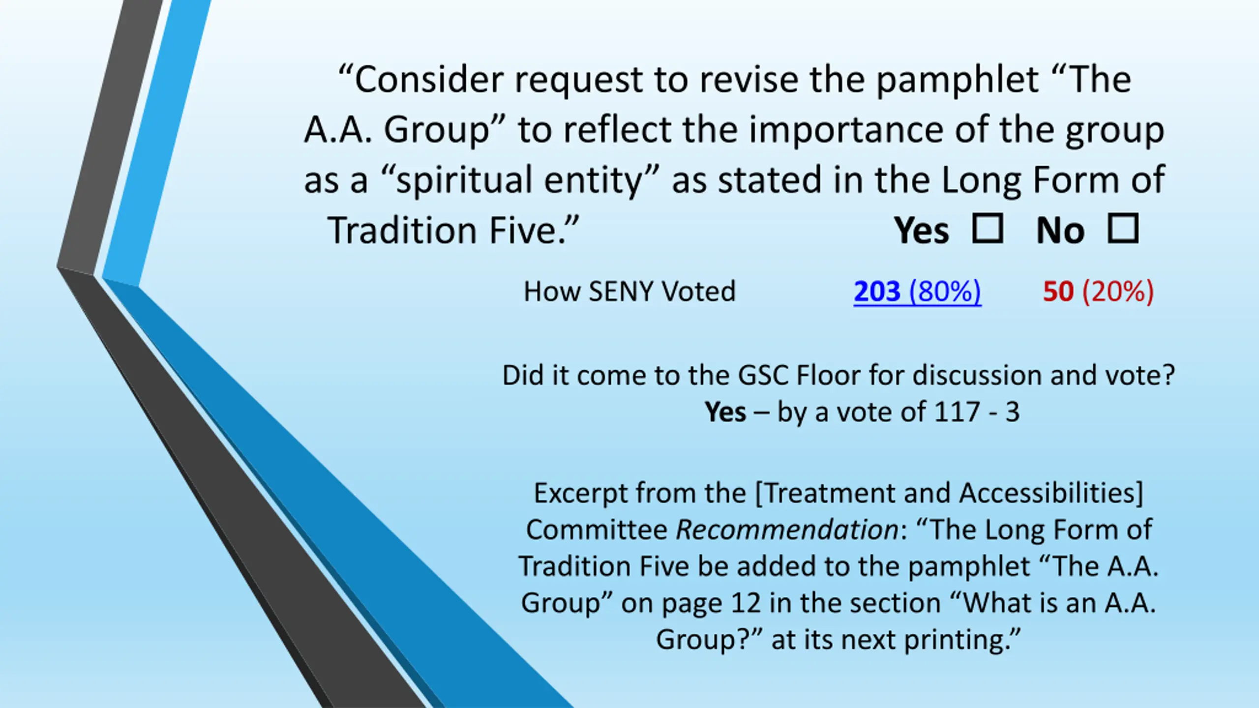 Consider request to revise the pamphlet The A.A. Group to reflect the importance of the group as a spiritual entity as stated in the Long Form of Tradition Five. Yes No How SENY Voted 203 (80%) 50 (20%) Did it come to the GSC Floor for discussion and vote? Yes by a vote of 117 - 3 Excerpt from the [Treatment and Accessibilities] Committee Recommendation: The Long Form of Tradition Five be added to the pamphlet The A.A. Group on page 12 in the section What is an A.A. Group? at its next printing.