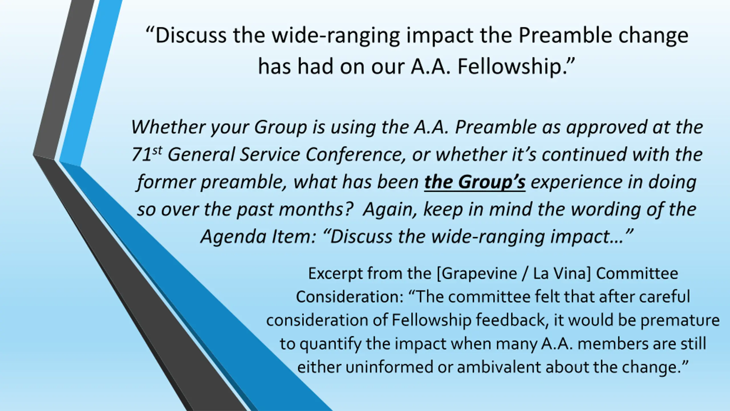 Discuss the wide-ranging impact the Preamble change has had on our A.A. Fellowship. Whether your Group is using the A.A. Preamble as approved at the 71stGeneral Service Conference, or whether it s continued with the former preamble, what has been the Group s experience in doing so over the past months? Again, keep in mind the wording of the Agenda Item: Discuss the wide-ranging impact Excerpt from the [Grapevine / La Vina] Committee Consideration: The committee felt that after careful consideration of Fellowship feedback, it would be premature to quantify the impact when many A.A. members are still either uninformed or ambivalent about the change.
