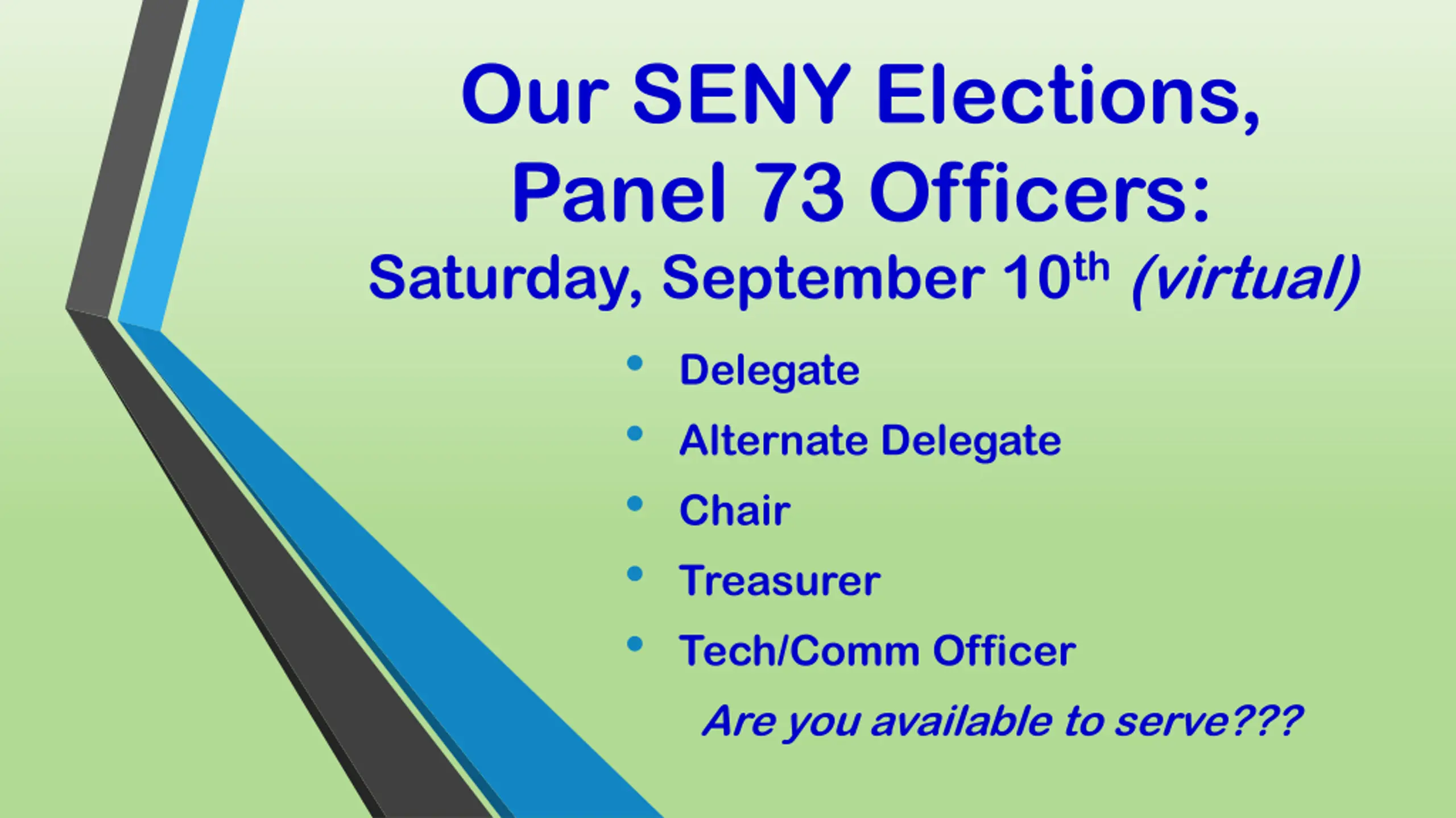 Our SENY Elections, Panel 73 Officers: Saturday, September 10th (virtual) Delegate Alternate Delegate Chair Treasurer Tech/Comm Officer Are you available to serve???