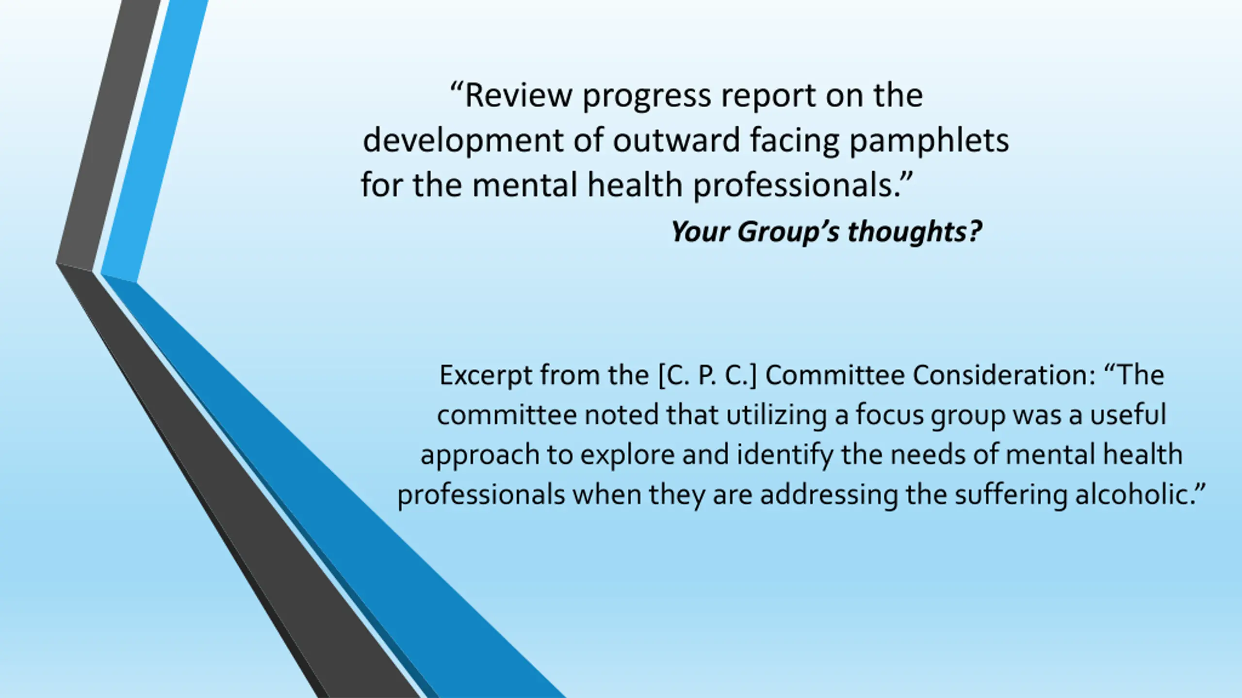 Review progress report on the development of outward facing pamphlets for the mental health professionals. Your Group s thoughts? Excerpt from the [C. P. C.] Committee Consideration: The committee noted that utilizing a focus group was a useful approach to explore and identify the needs of mental health professionals when they are addressing the suffering alcoholic.
