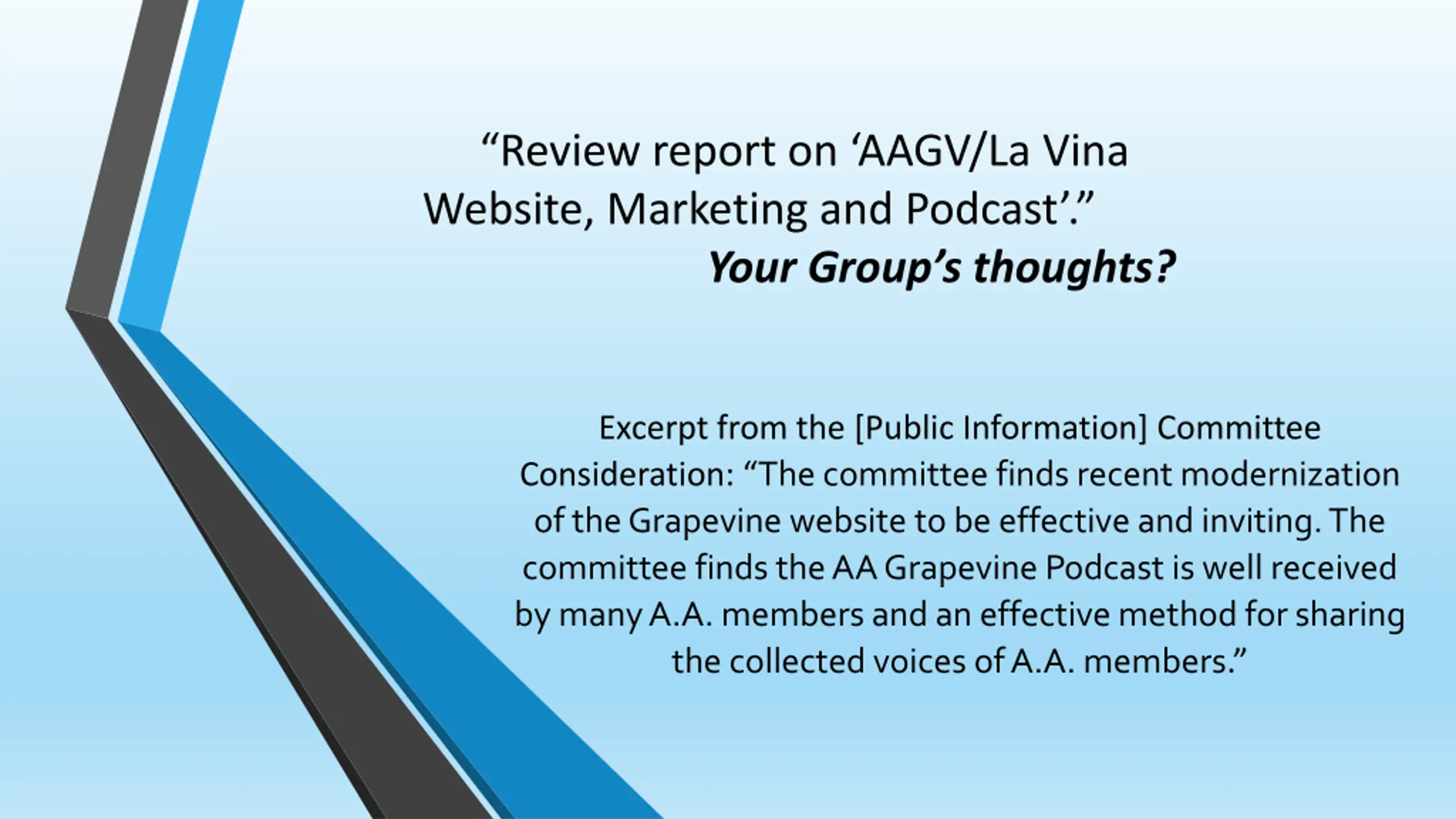 Review report on AAGV/La Vina Website, Marketing and Podcast . Your Group s thoughts? Excerpt from the [Public Information] Committee Consideration: The committee finds recent modernization of the Grapevine website to be effective and inviting. The committee finds the AA Grapevine Podcast is well received by many A.A. members and an effective method for sharing the collected voices of A.A. members.