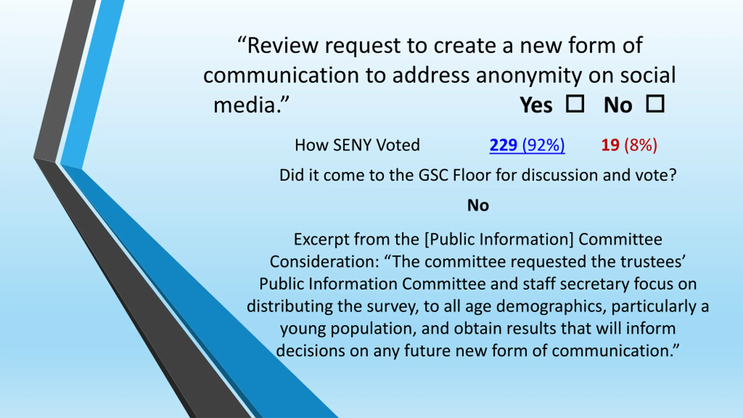 Review request to create a new form of communication to address anonymity on social media. Yes No How SENY Voted 229 (92%) 19 (8%) Did it come to the GSC Floor for discussion and vote? No Excerpt from the [Public Information] Committee Consideration: The committee requested the trustees Public Information Committee and staff secretary focus on distributing the survey, to all age demographics, particularly a young population, and obtain results that will inform decisions on any future new form of communication.