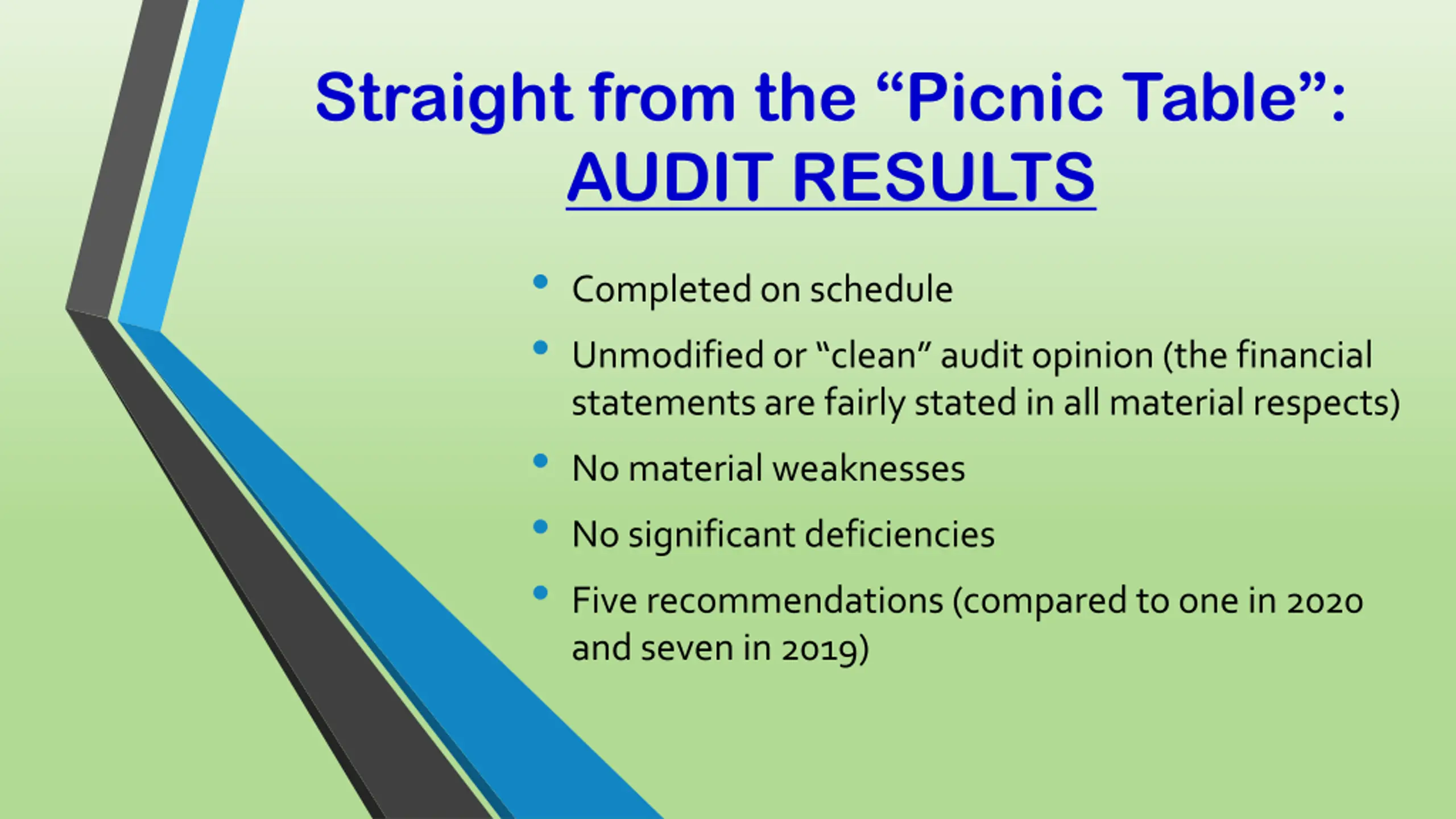 Straight from the Picnic Table: AUDIT RESULTS Completed on schedule Unmodified or clean audit opinion (the financial statements are fairly stated in all material respects) No material weaknesses No significant deficiencies Five recommendations (compared to one in 2020 and seven in 2019)