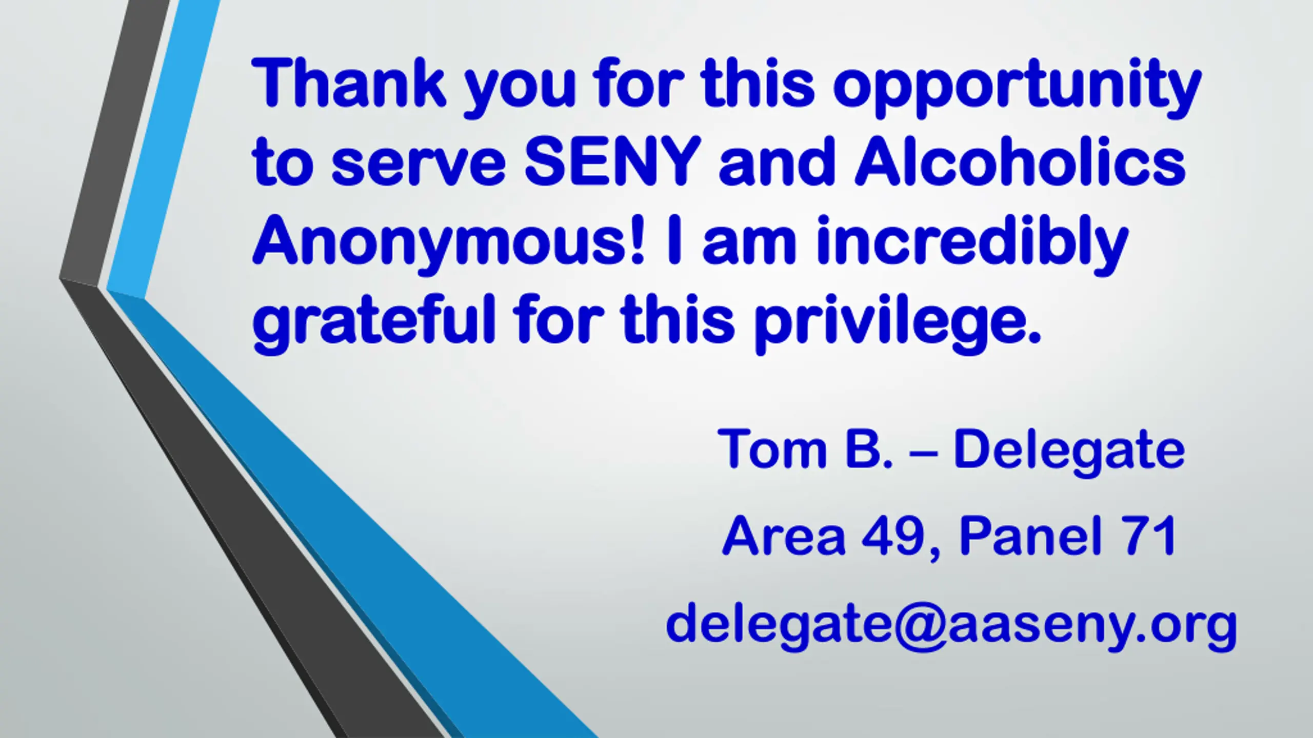 Thank you for this opportunity Thank you for this opportunity to serve SENY and Alcoholics to serve SENY and Alcoholics Anonymous! I am incredibly Anonymous! I am incredibly grateful for this privilege. grateful for this privilege. Tom B. Delegate Area 49, Panel 71 delegate@aaseny.org