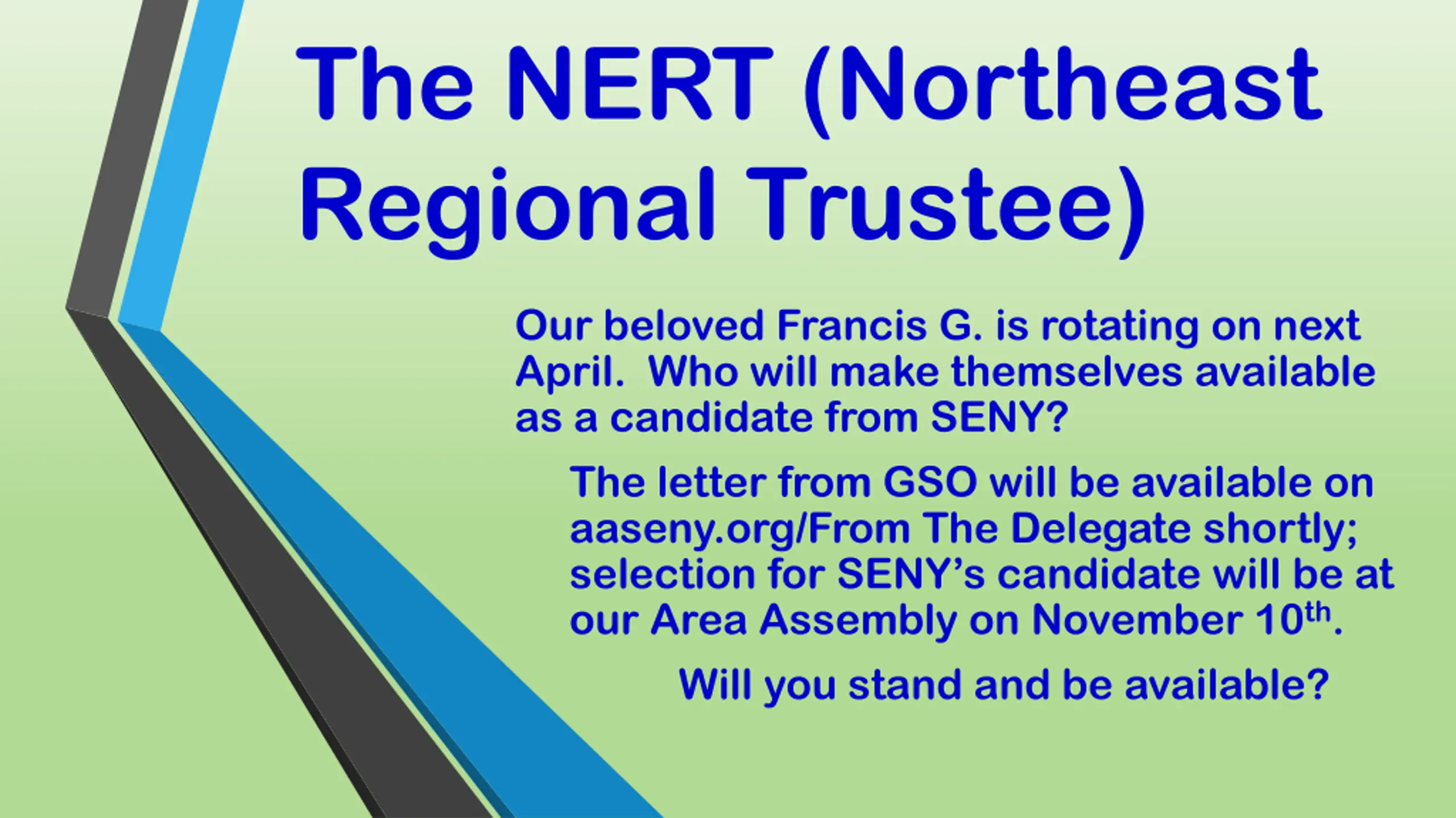 The NERT (Northeast Regional Trustee) Our beloved Francis G. is rotating on next April. Who will make themselves available as a candidate from SENY? The letter from GSO will be available on aaseny.org/From The Delegate shortly; selection for SENY s candidate will be at our Area Assembly on November 10th. Will you stand and be available?