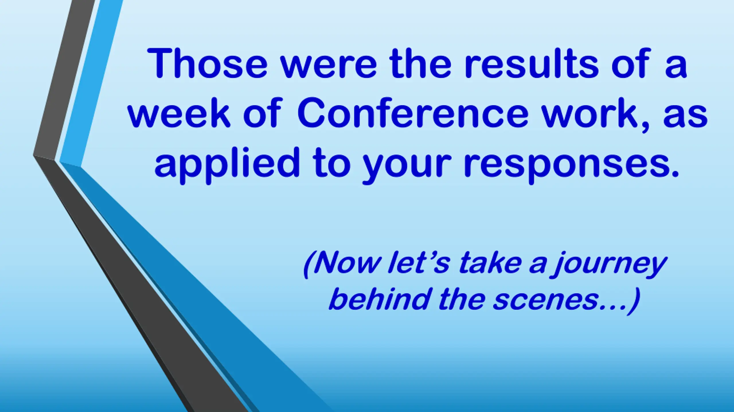 Those were the results of a week of Conference work, as applied to your responses. (Now let s take a journey behind the scenes )