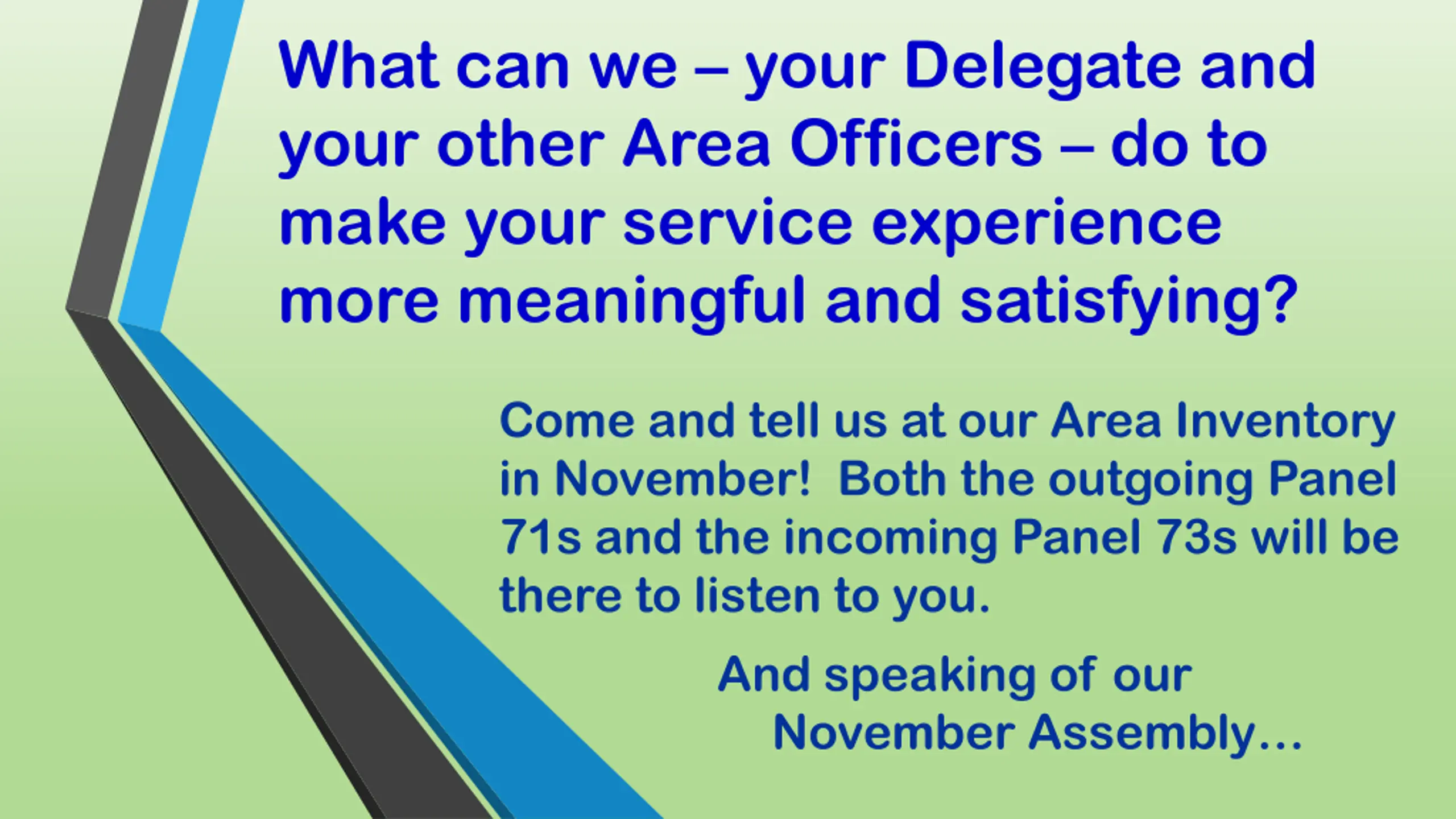 What can we your Delegate and your other Area Officers do to make your service experience more meaningful and satisfying? Come and tell us at our Area Inventory in November! Both the outgoing Panel 71s and the incoming Panel 73s will be there to listen to you. And speaking of our November Assembly