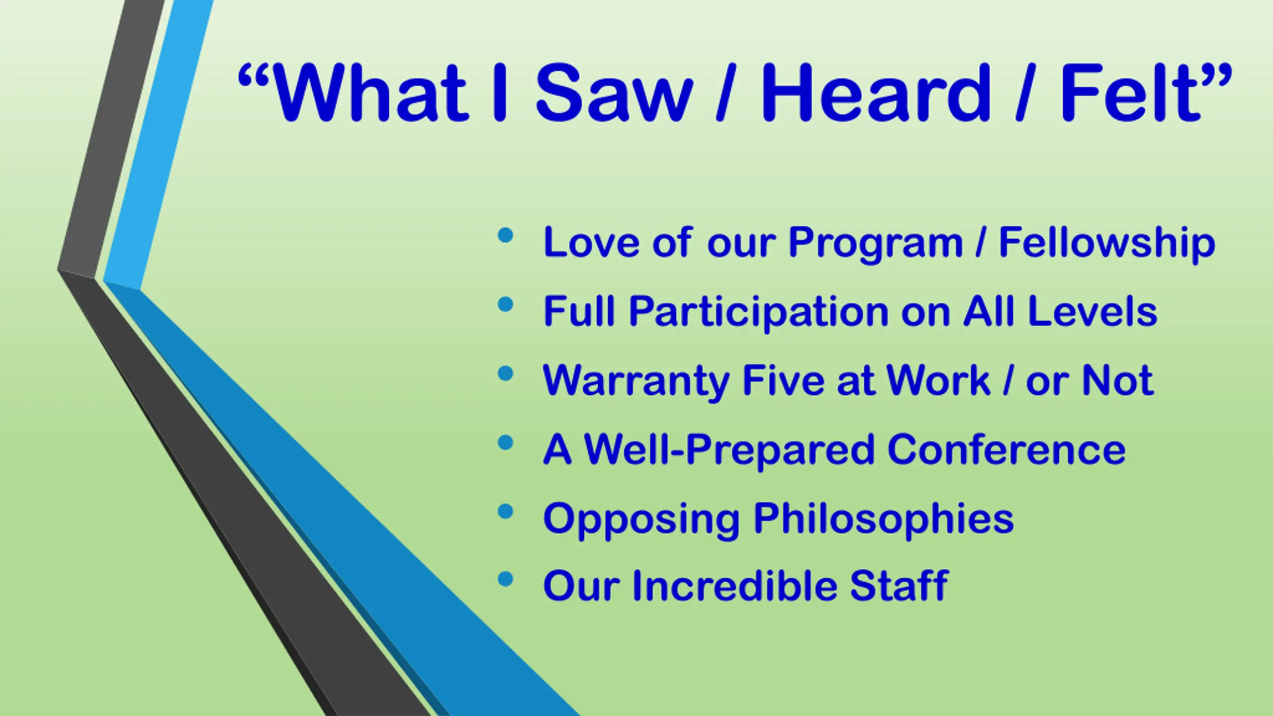 What I Saw / Heard / Felt Love of our Program / Fellowship Full Participation on All Levels Warranty Five at Work / or Not A Well-Prepared Conference Opposing Philosophies Our Incredible Staff