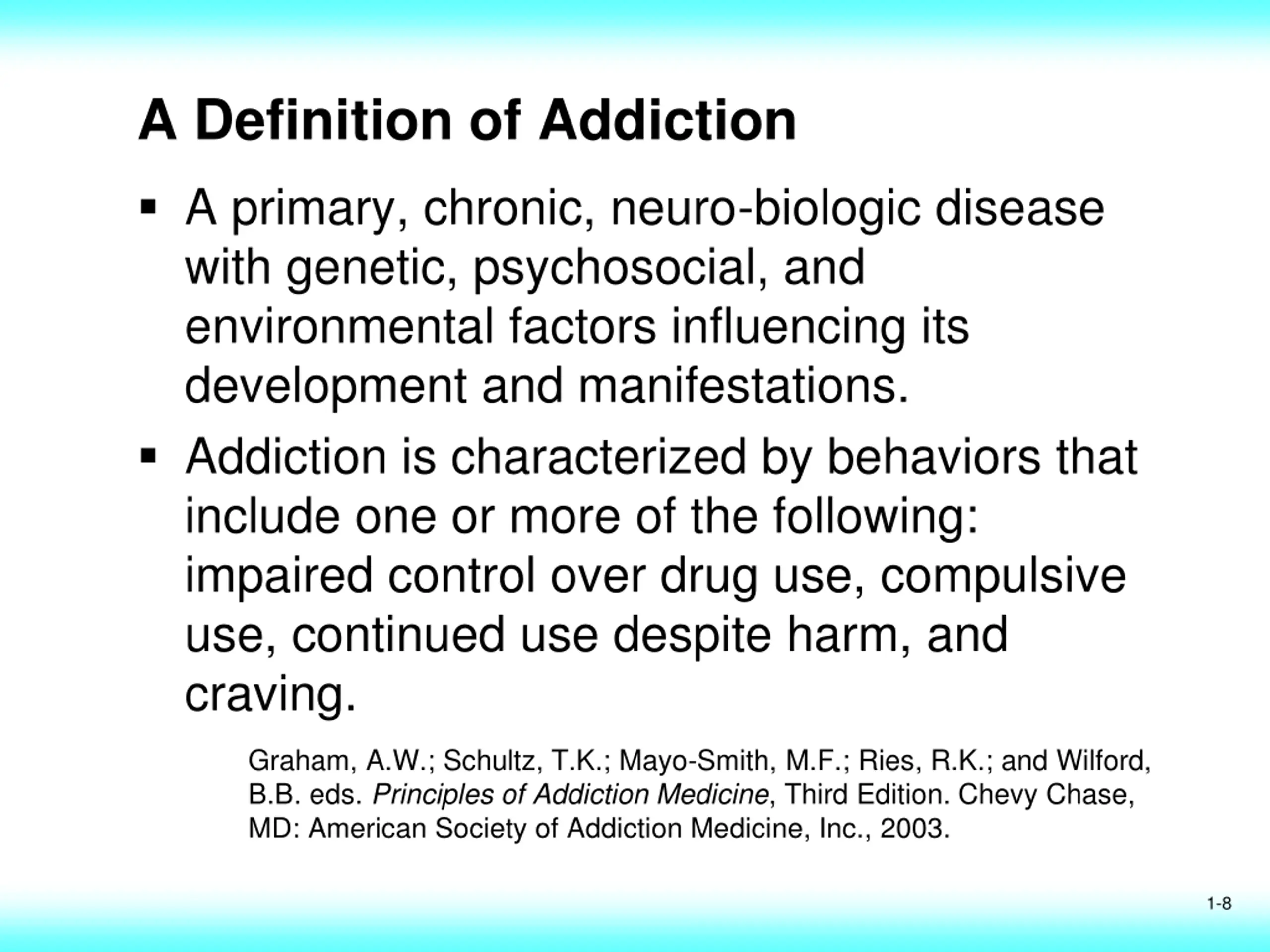 A Definition of Addiction A primary, chronic, neuro-biologic disease with genetic, psychosocial, and environmental factors influencing its development and manifestations. Addiction is characterized by behaviors that include one or more of the following: impaired control over drug use, compulsive use, continued use despite harm, and craving. Graham, A.W.; Schultz, T.K.; Mayo-Smith, M.F.; Ries, R.K.; and Wilford, B.B. eds. Principles of Addiction Medicine, Third Edition. Chevy Chase, MD: American Society of Addiction Medicine, Inc., 2003. 1-8