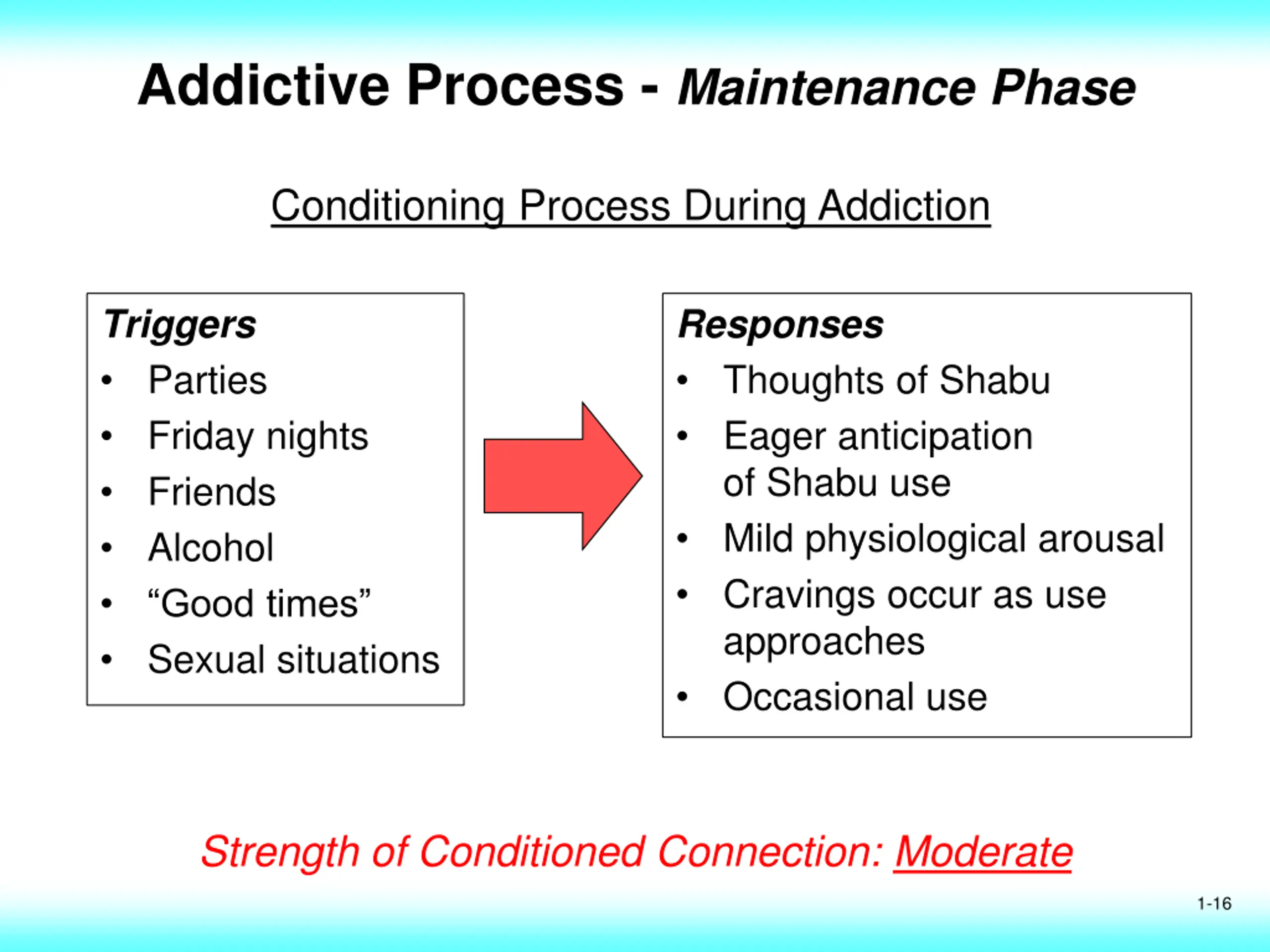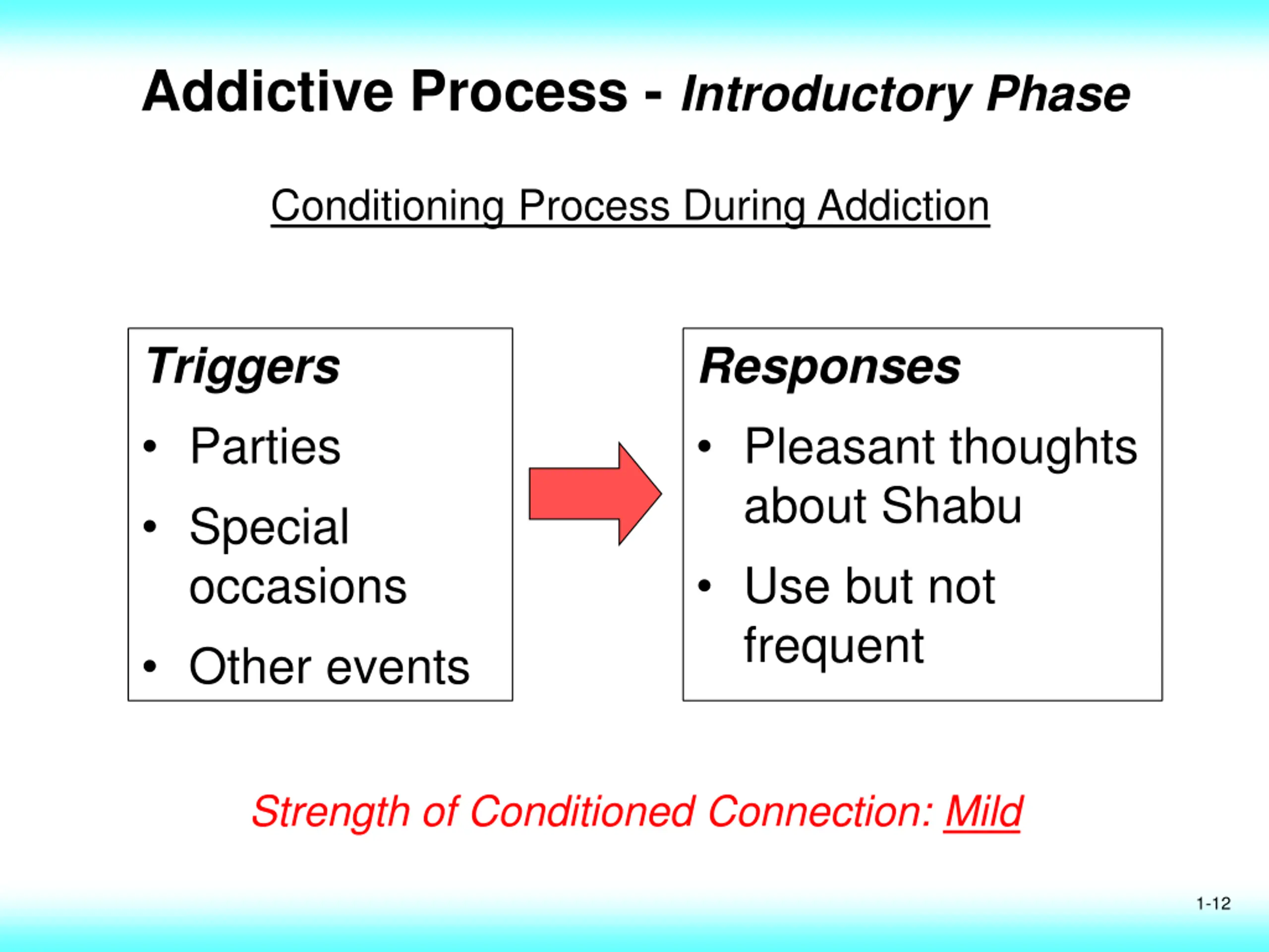 Addictive Process - Introductory Phase Conditioning Process During Addiction Triggers Parties Special occasions Other events Responses Pleasant thoughts about Shabu Use but not frequent Strength of Conditioned Connection: Mild 1-12