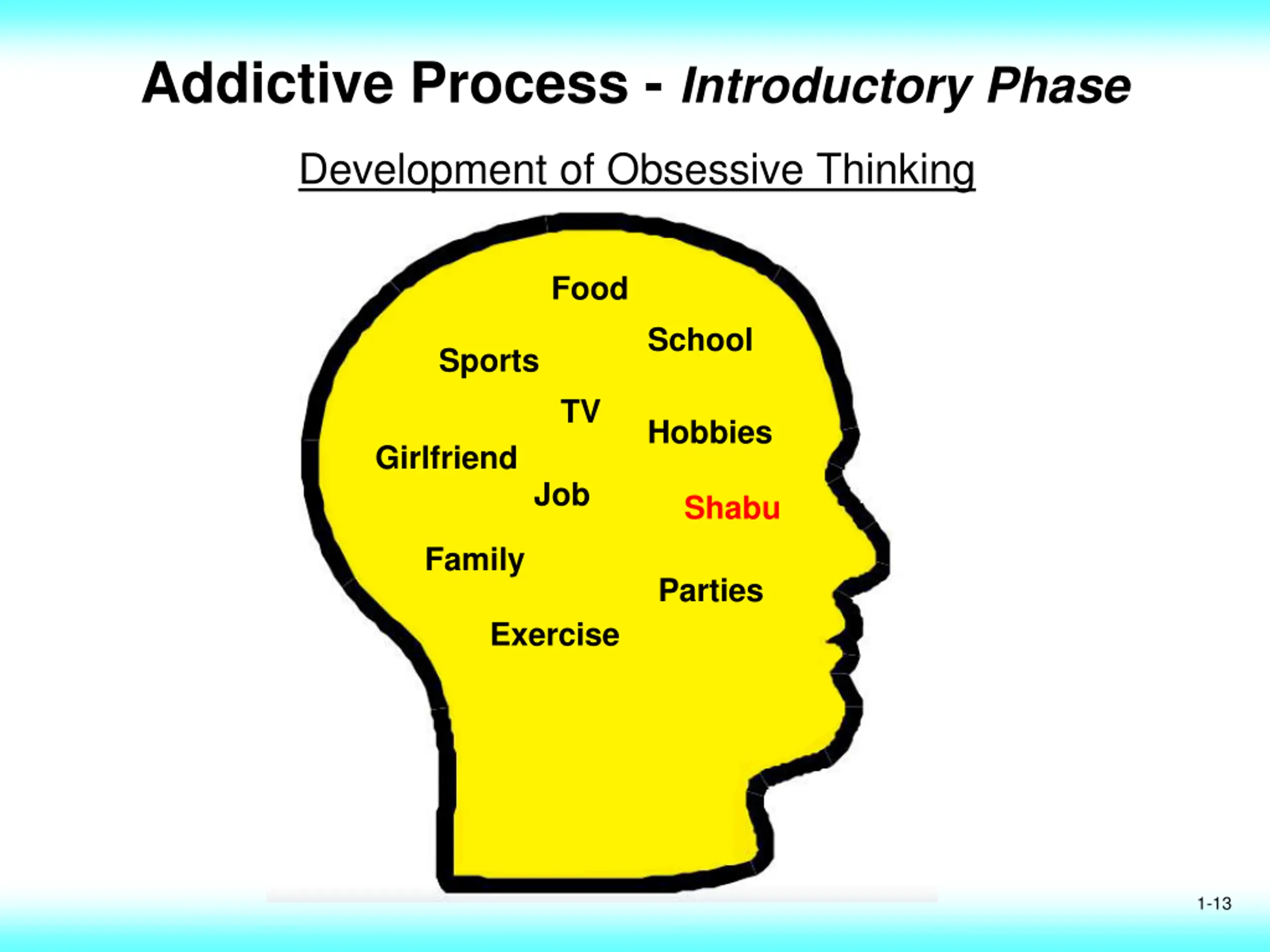 Addictive Process - Introductory Phase Development of Obsessive Thinking Food School Sports TV Hobbies Girlfriend Job Shabu Family Parties Exercise 1-13