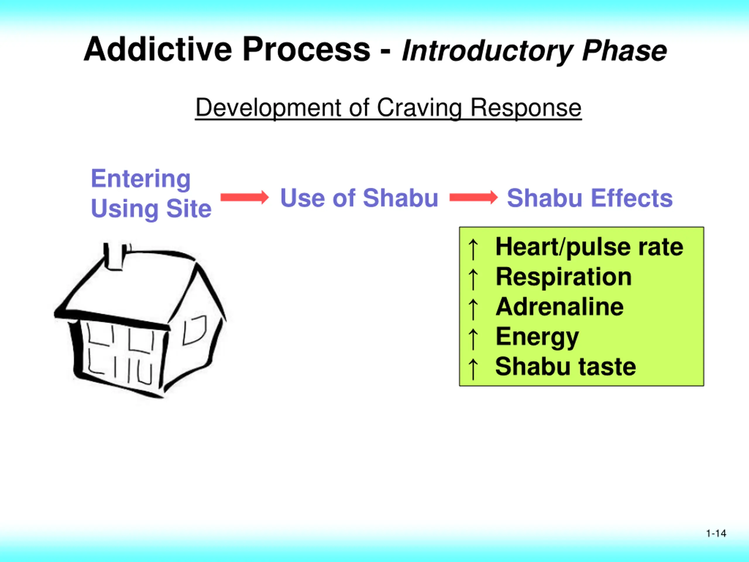 Addictive Process - Introductory Phase Development of Craving Response Entering Using Site Use of Shabu Shabu Effects Heart/pulse rate Respiration Adrenaline Energy Shabu taste 1-14