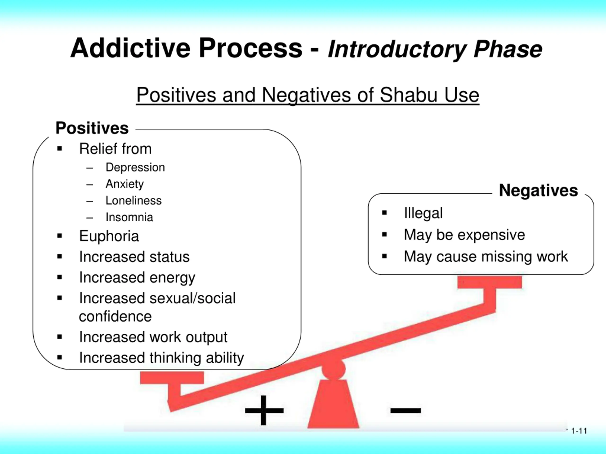 Addictive Process - Introductory Phase Positives and Negatives of Shabu Use Positives Relief from Depression Anxiety Loneliness Insomnia Euphoria Increased status Increased energy Increased sexual/social confidence Increased work output Increased thinking ability Negatives Illegal May be expensive May cause missing work 1-11