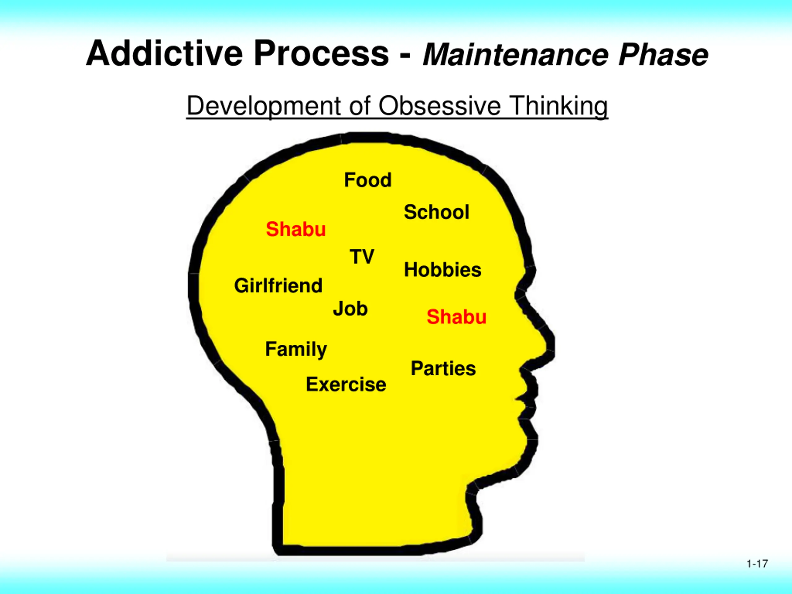 Addictive Process - Maintenance Phase Development of Obsessive Thinking Food School Shabu TV Hobbies Girlfriend Job Shabu Family Parties Exercise 1-17