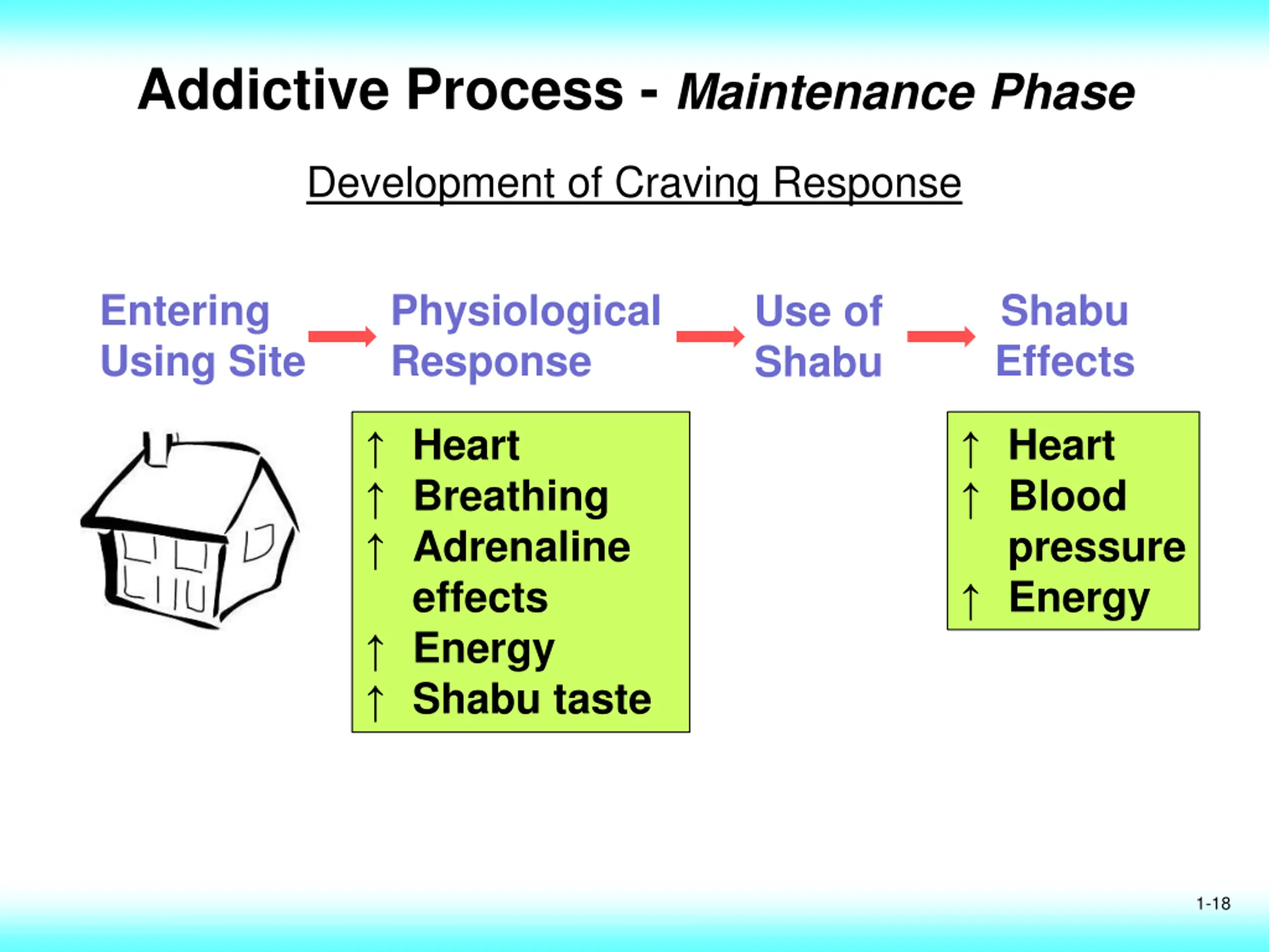 Addictive Process - Maintenance Phase Development of Craving Response Entering Using Site Physiological Response Shabu Effects Use of Shabu Heart Breathing Adrenaline effects Energy Shabu taste Heart Blood pressure Energy 1-18